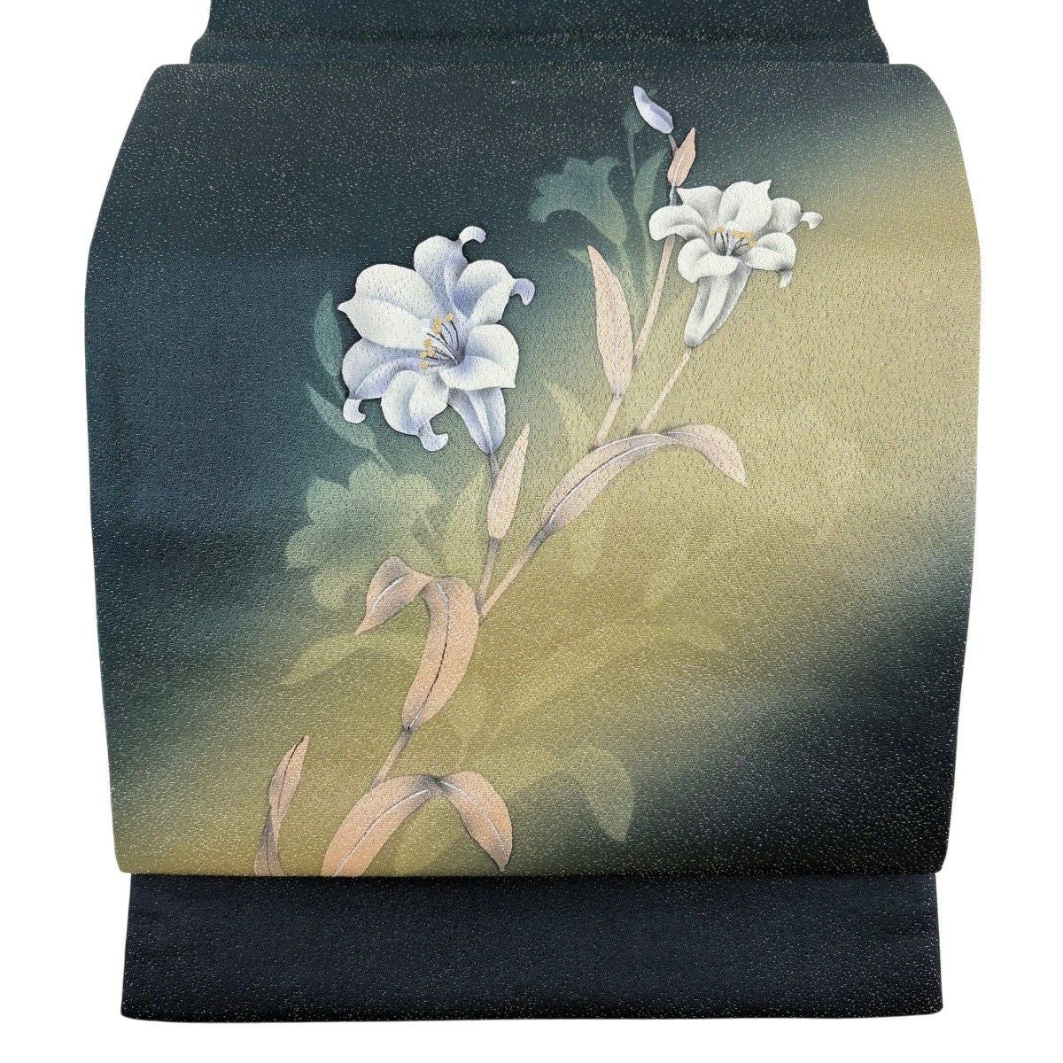 【美品】 袋帯 名品 草花 銀糸 深緑 お太鼓柄 正絹