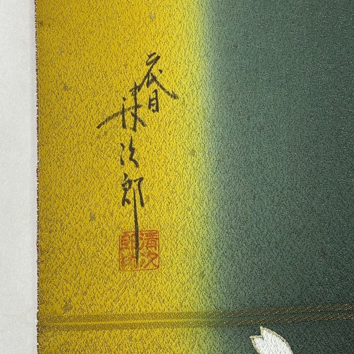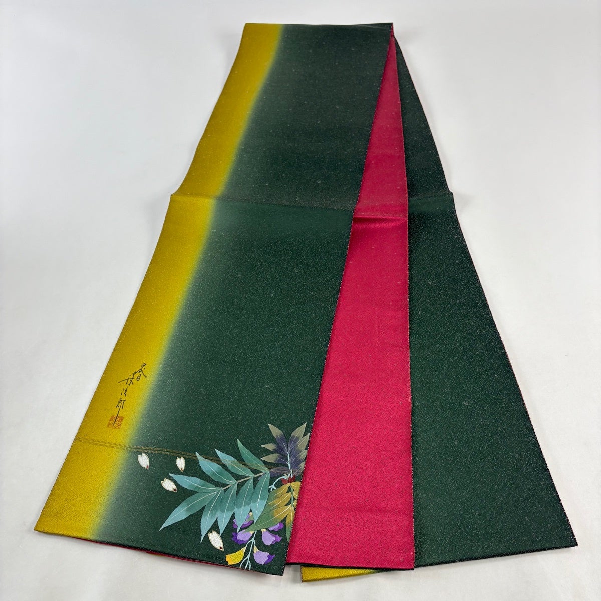 40%OFF 【美品】 袋帯 逸品 じゅらく 落款あり 草花 波 刺繍 箔 深緑 六通 正絹 K30