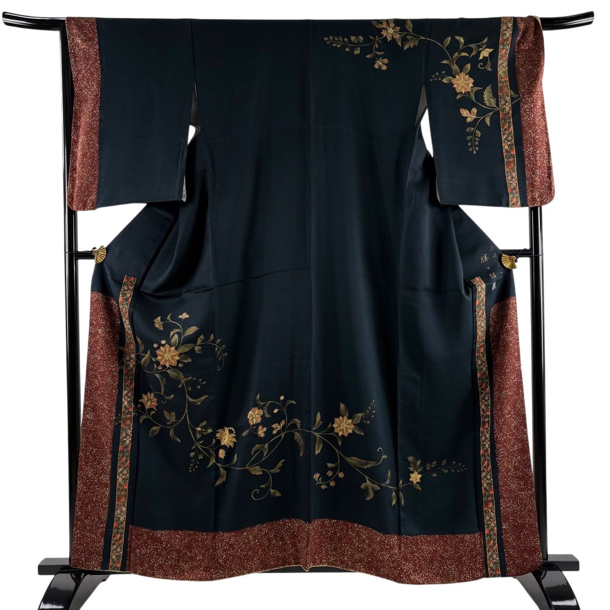 【美品】 大島紬 身丈163.5cm 裄丈64cm M 袷 純泥染 証紙あり 草花 唐草 深緑 正絹 名品