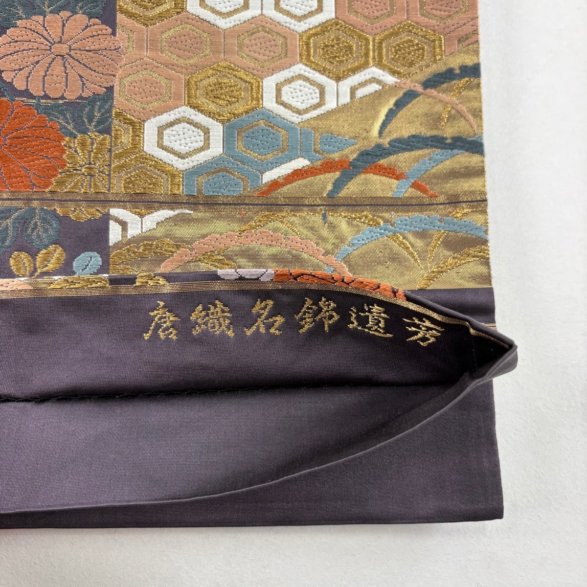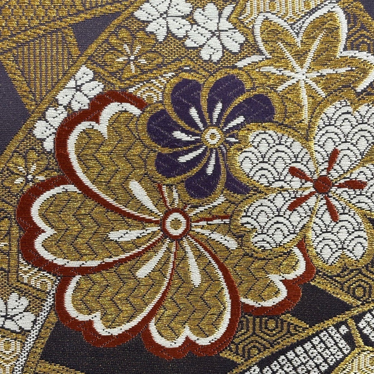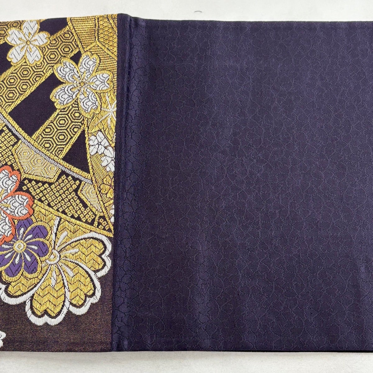 【美品】 袋帯 秀品 証紙あり 菊 七宝文 金糸 箔 濃紫 お太鼓柄 正絹