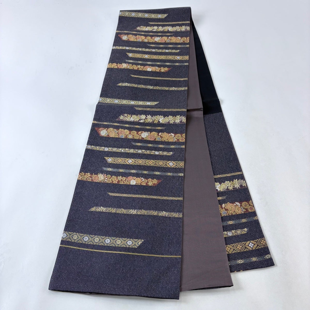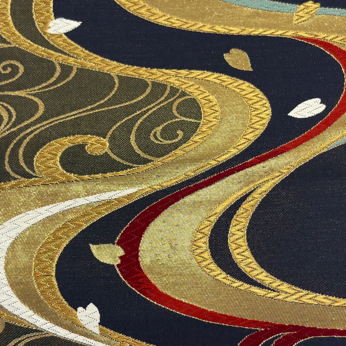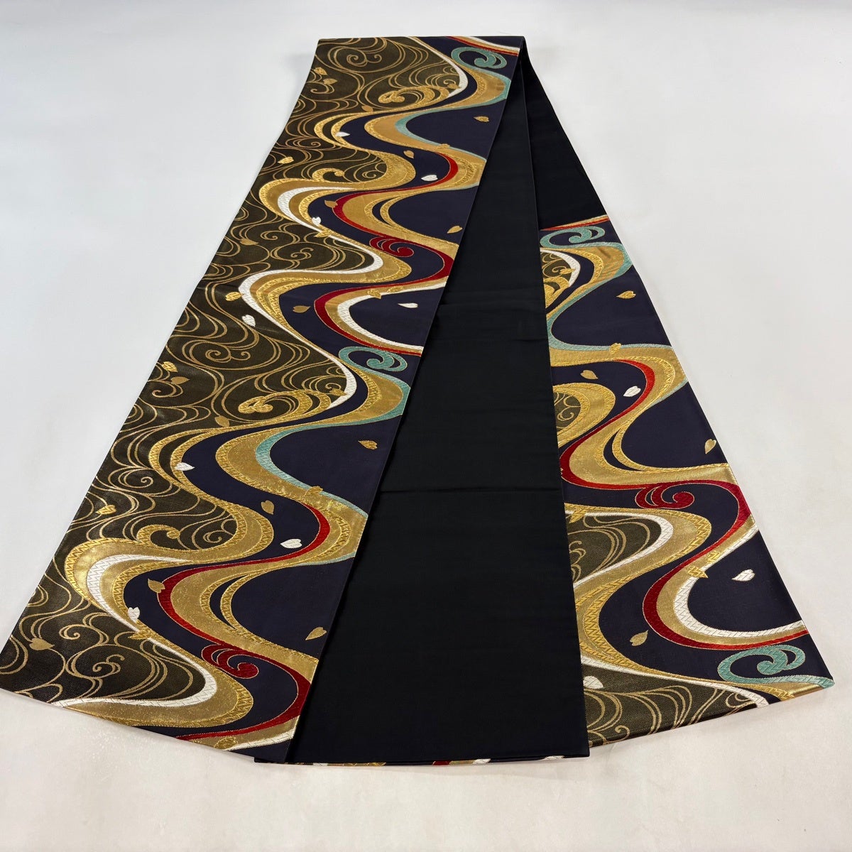 【美品】 袋帯 秀品 鈴乃屋 流水 花びら 金糸 刺繍 濃紫 六通 正絹