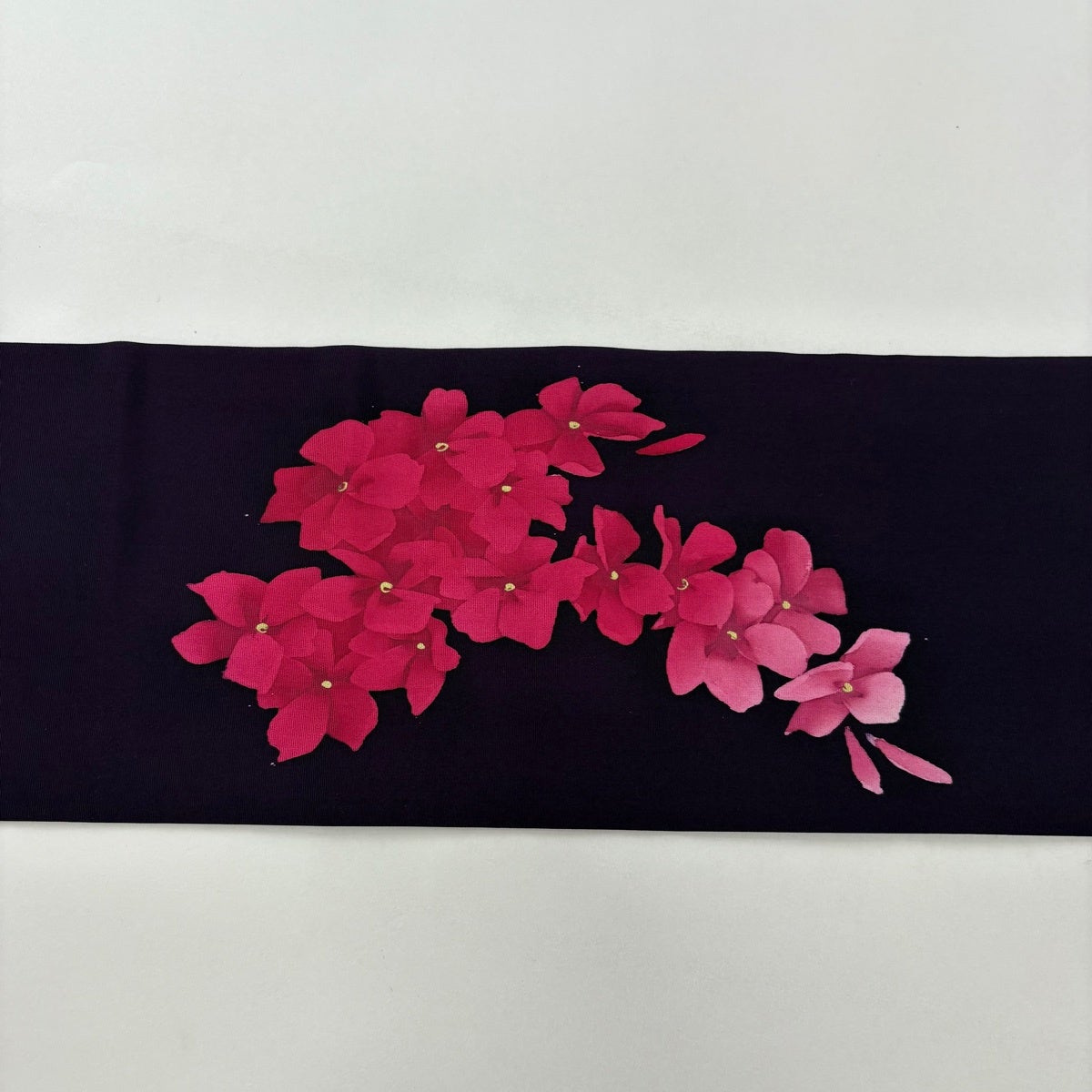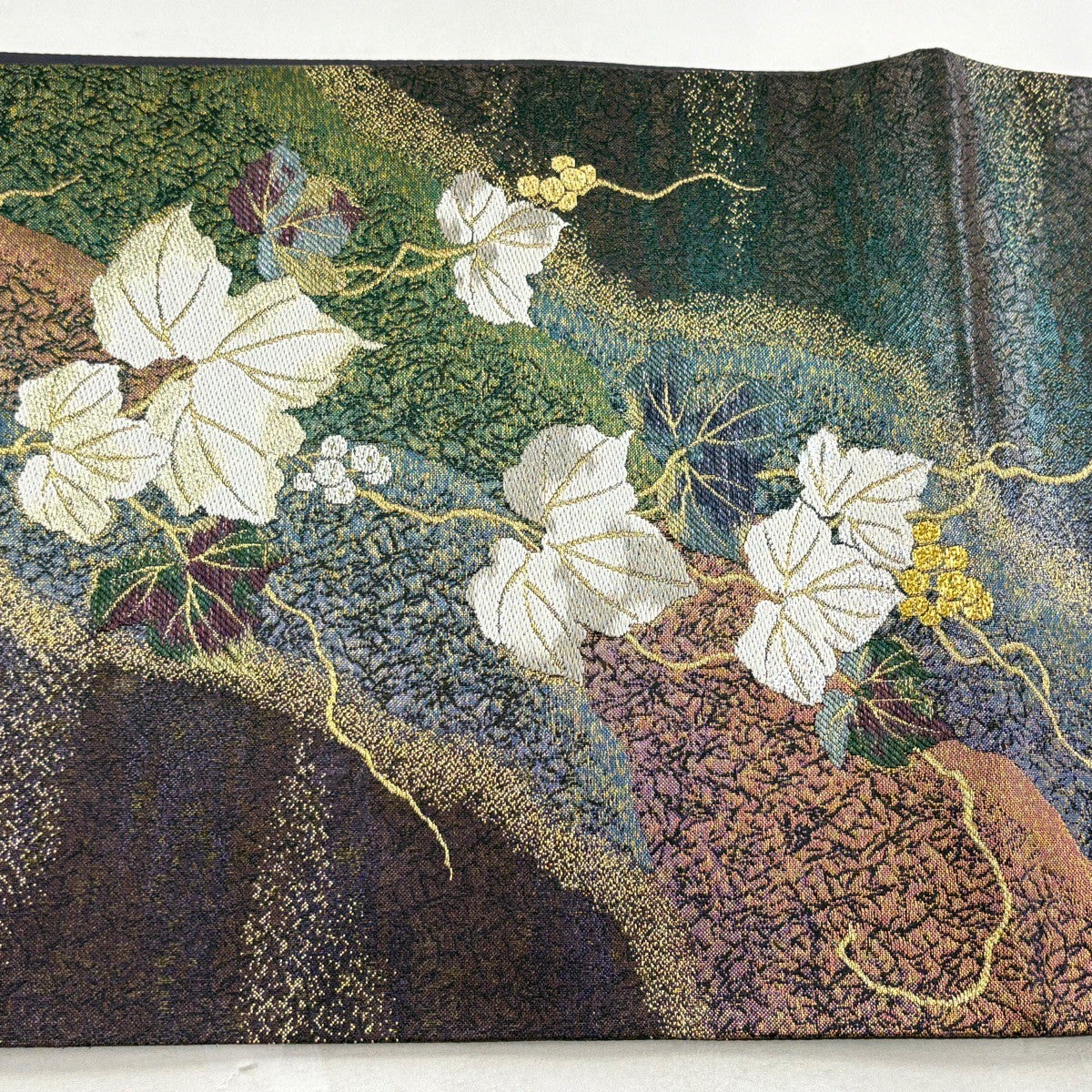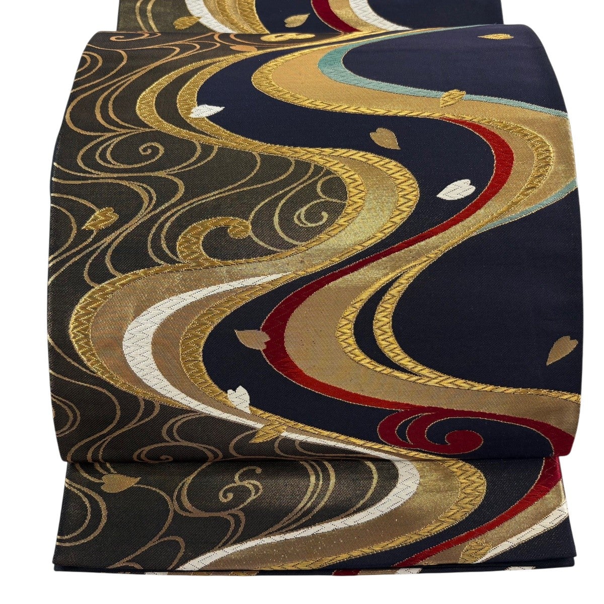 【美品】 袋帯 秀品 鈴乃屋 流水 花びら 金糸 刺繍 濃紫 六通 正絹