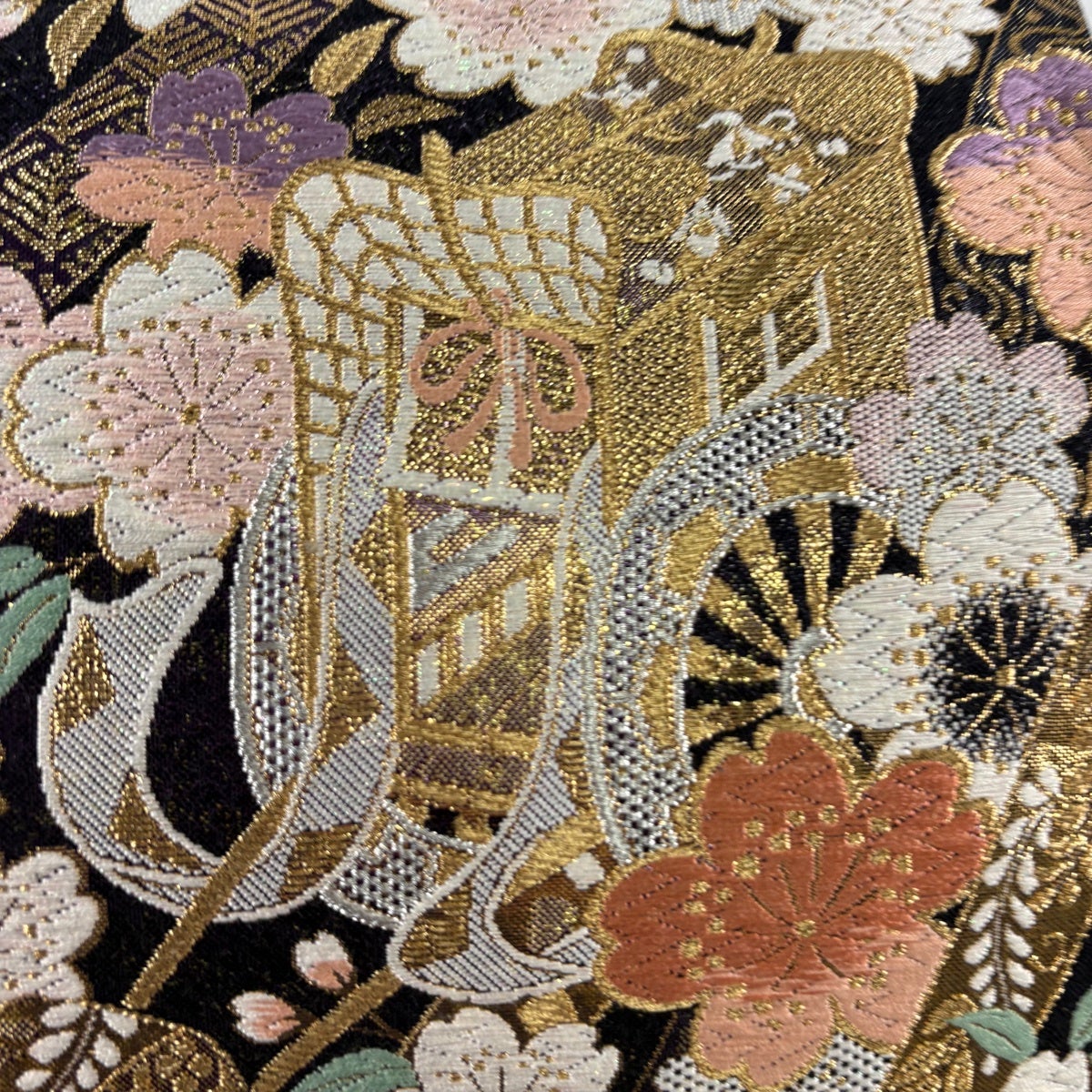 【美品】 袋帯 秀品 振袖向き 御所車 桜 箔 金銀糸 濃紫 六通 正絹