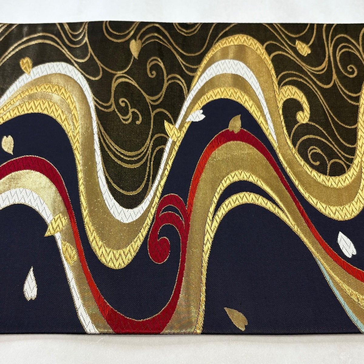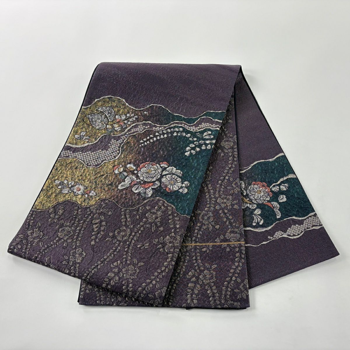 30%OFF 袋帯 秀品 桜 波 金銀糸 箔 濃紫 六通 正絹 K30