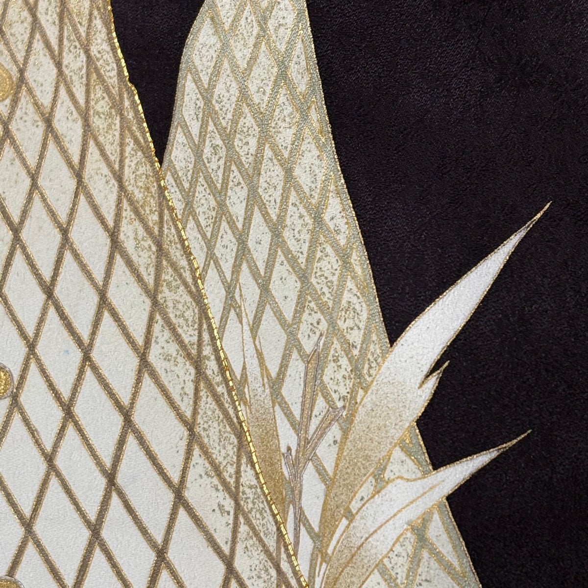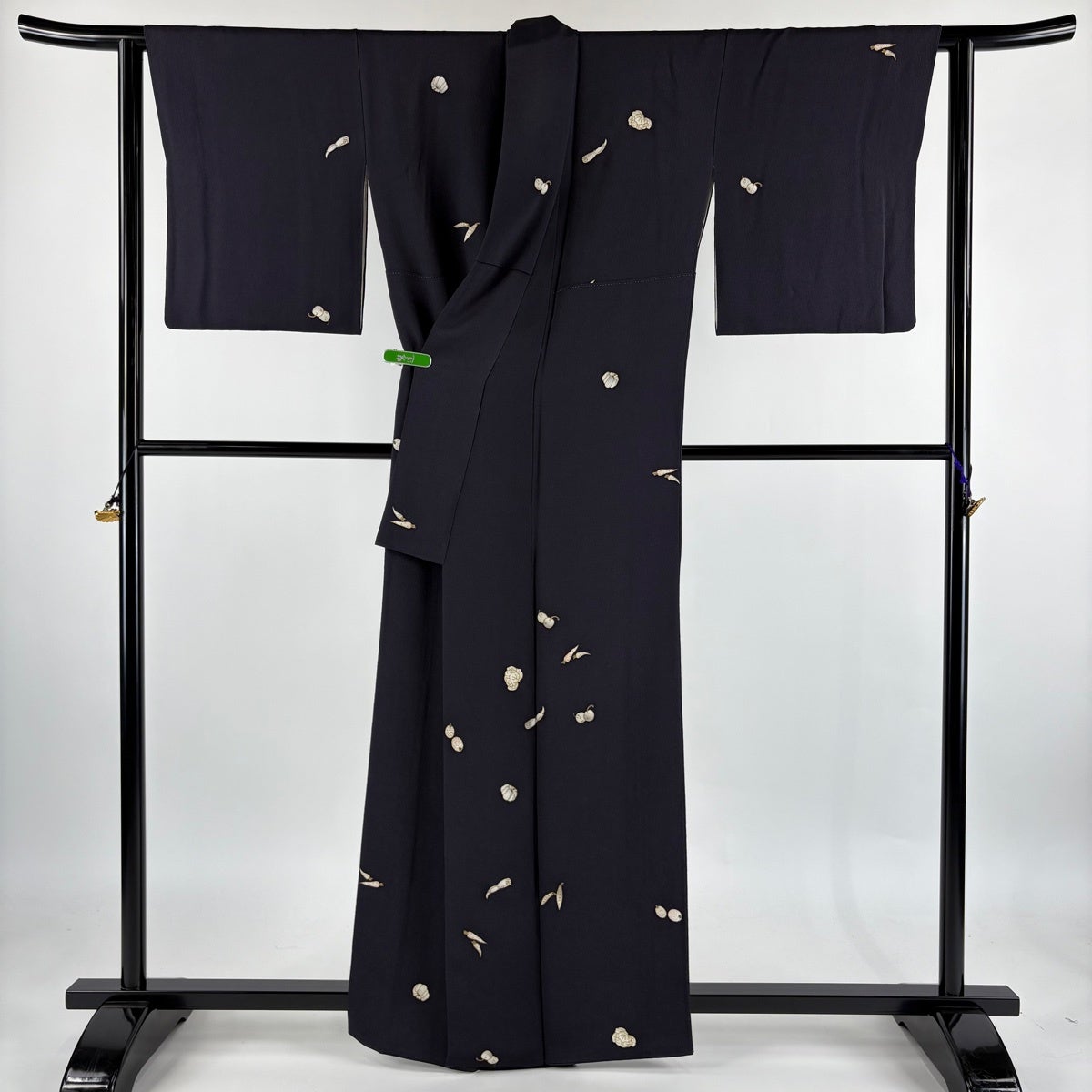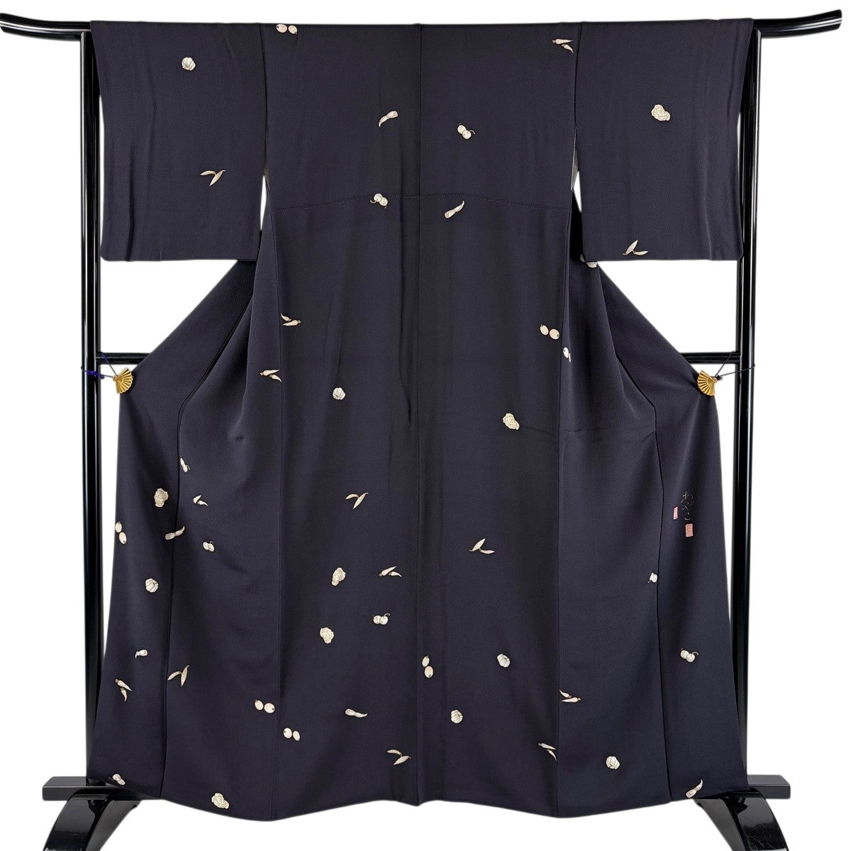 50%OFF 付下げ 身丈155cm 裄丈62cm S 袷 紬地 扇面 葉柄 金彩 濃紫 正絹 秀品 K50