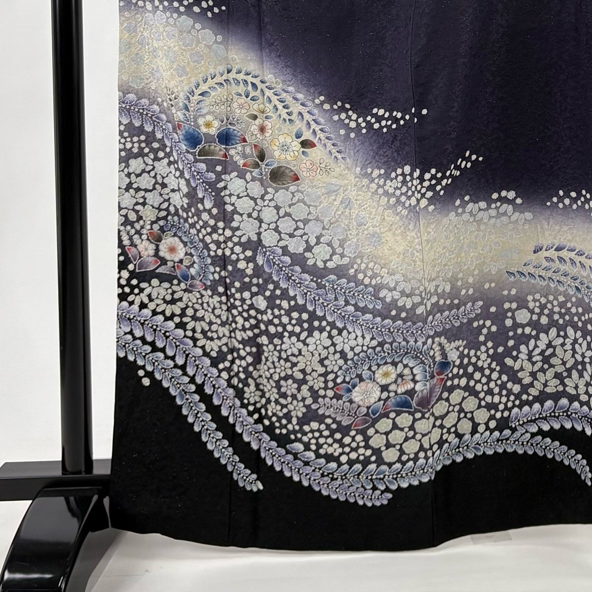 50%OFF 振袖 身丈165cm 裄丈72.5cm L 袷 蘭 草花 銀通し 金糸 濃紫 正絹 逸品 K50