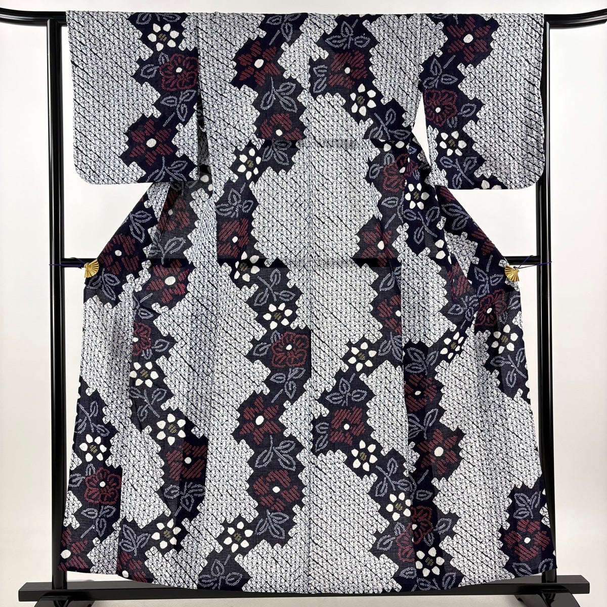 結城紬 身丈158cm 裄丈66cm M 袷 本場結城紬 100亀甲 証紙あり 牡丹 楓 濃紺 正絹 逸品