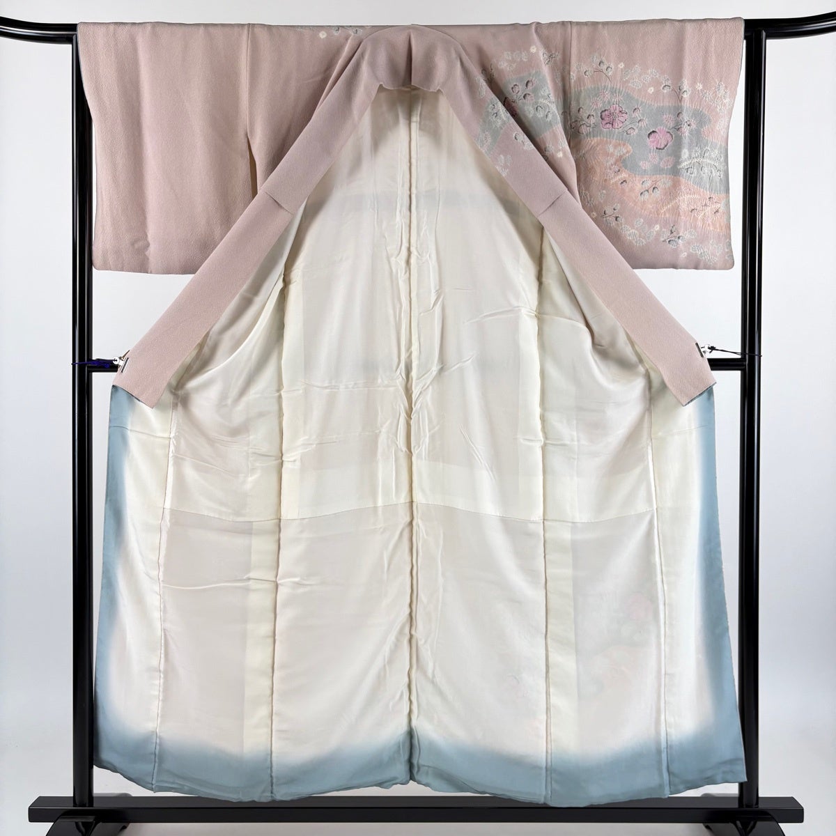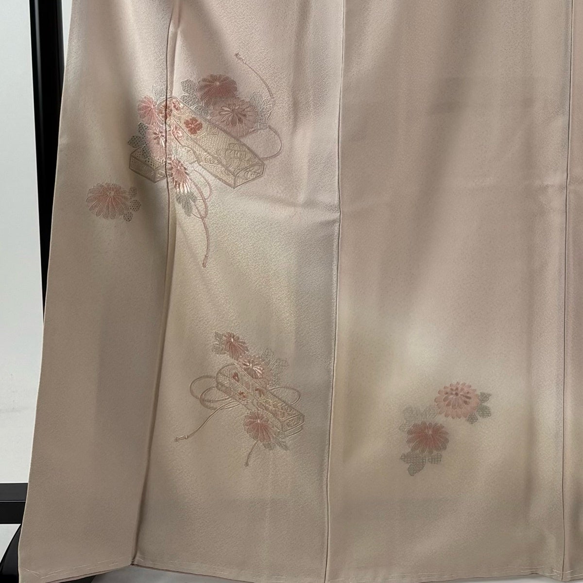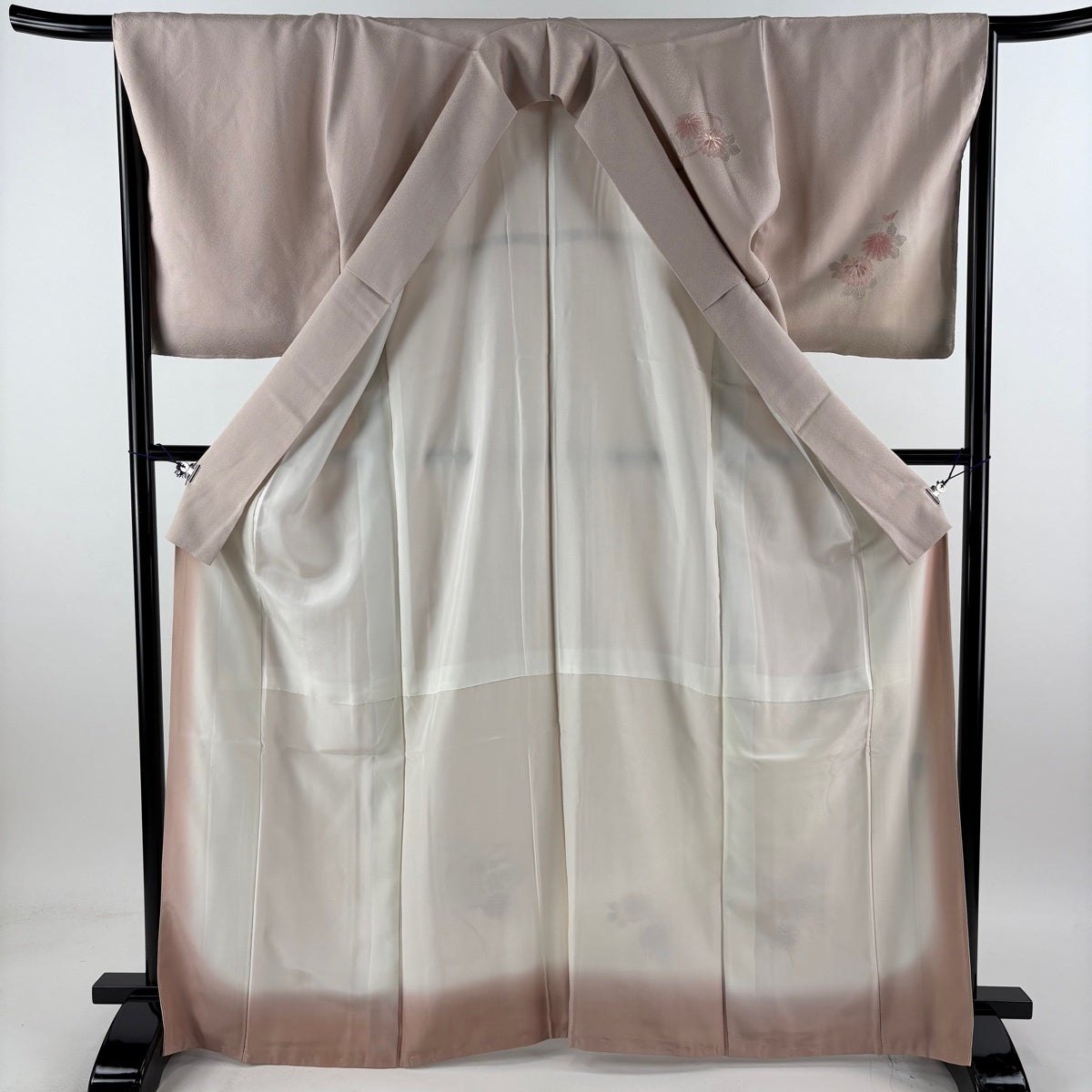 【美品】 付下げ 身丈167.5cm 裄丈67cm M 袷 文箱 菊 刺繍 ぼかし 灰桜 正絹 秀品 一つ紋