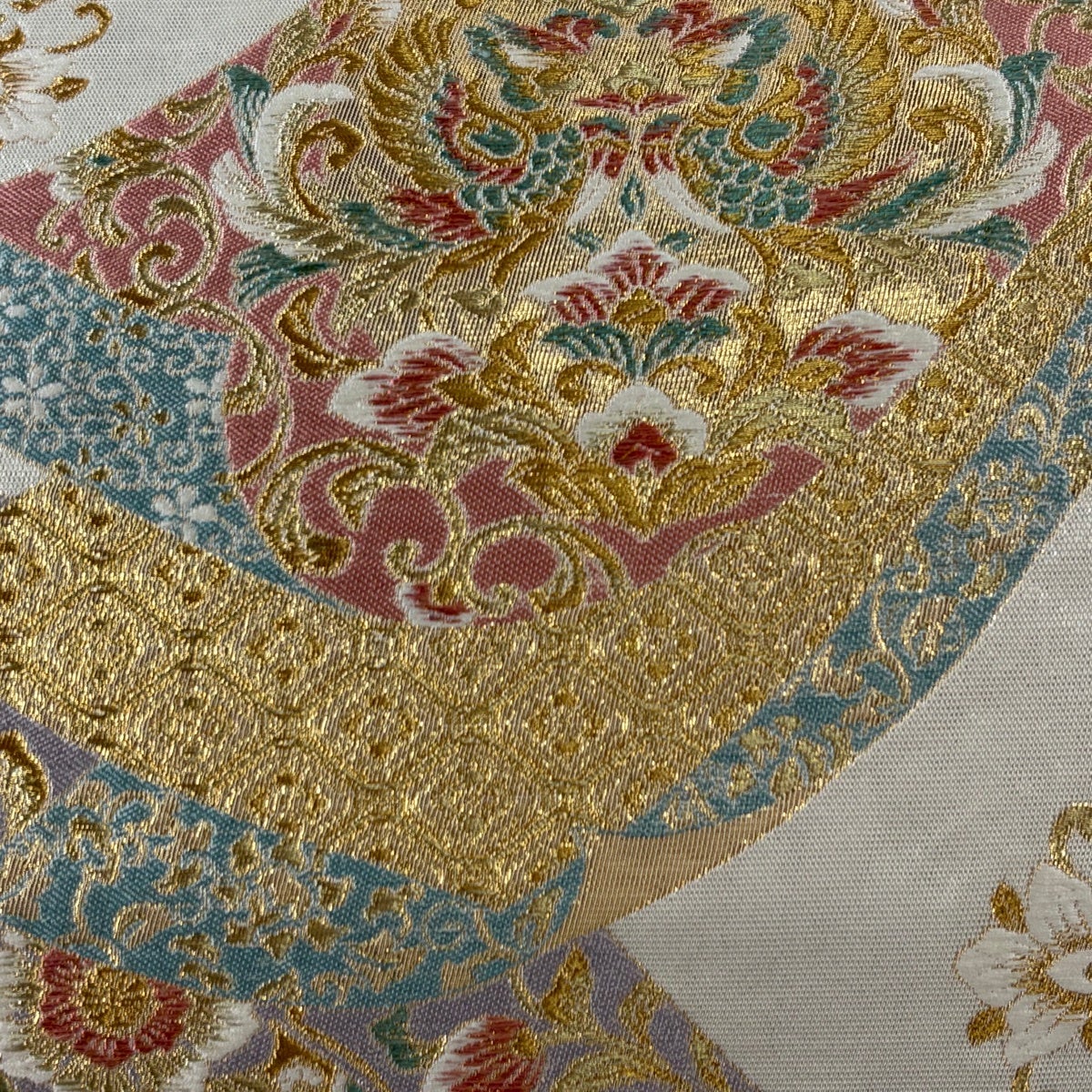 【美品】 袋帯 名品 丸文 向かい鳥 唐織 灰白 六通 正絹