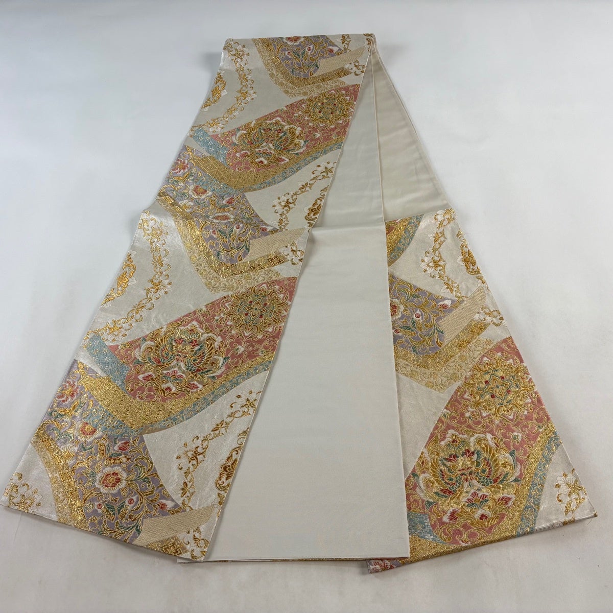 【美品】 袋帯 秀品 証紙あり 花 金糸 灰白 六通 化繊