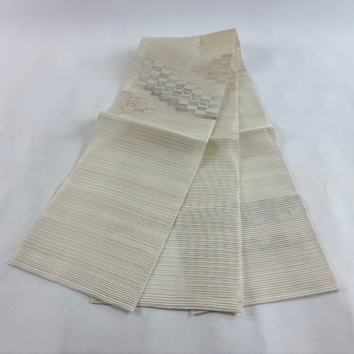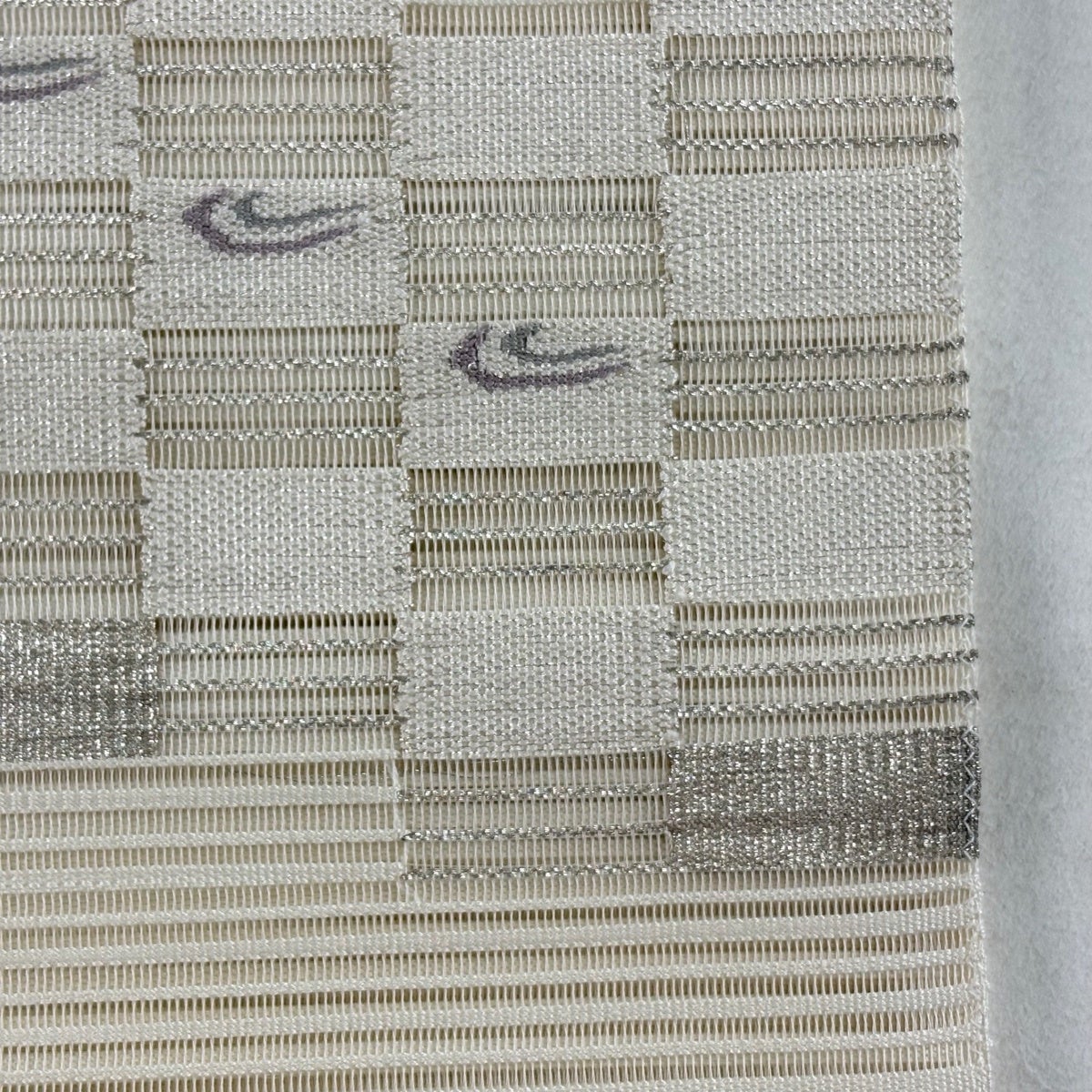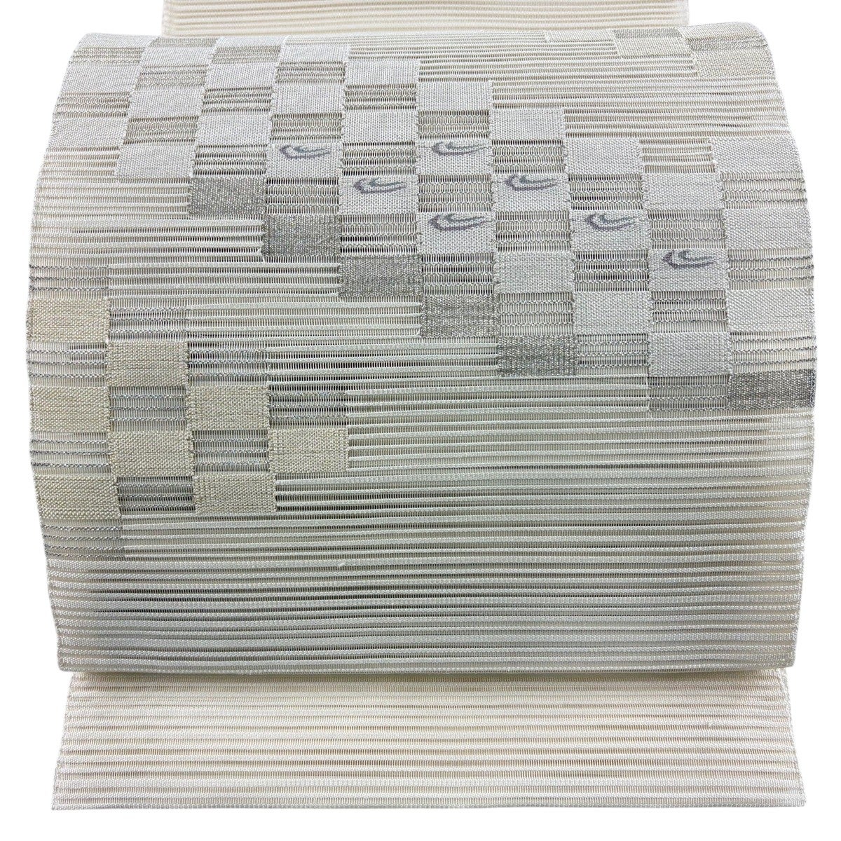 名古屋帯 秀品 夏帯 絽 八寸名古屋帯 市松 流水 銀糸 灰白 正絹