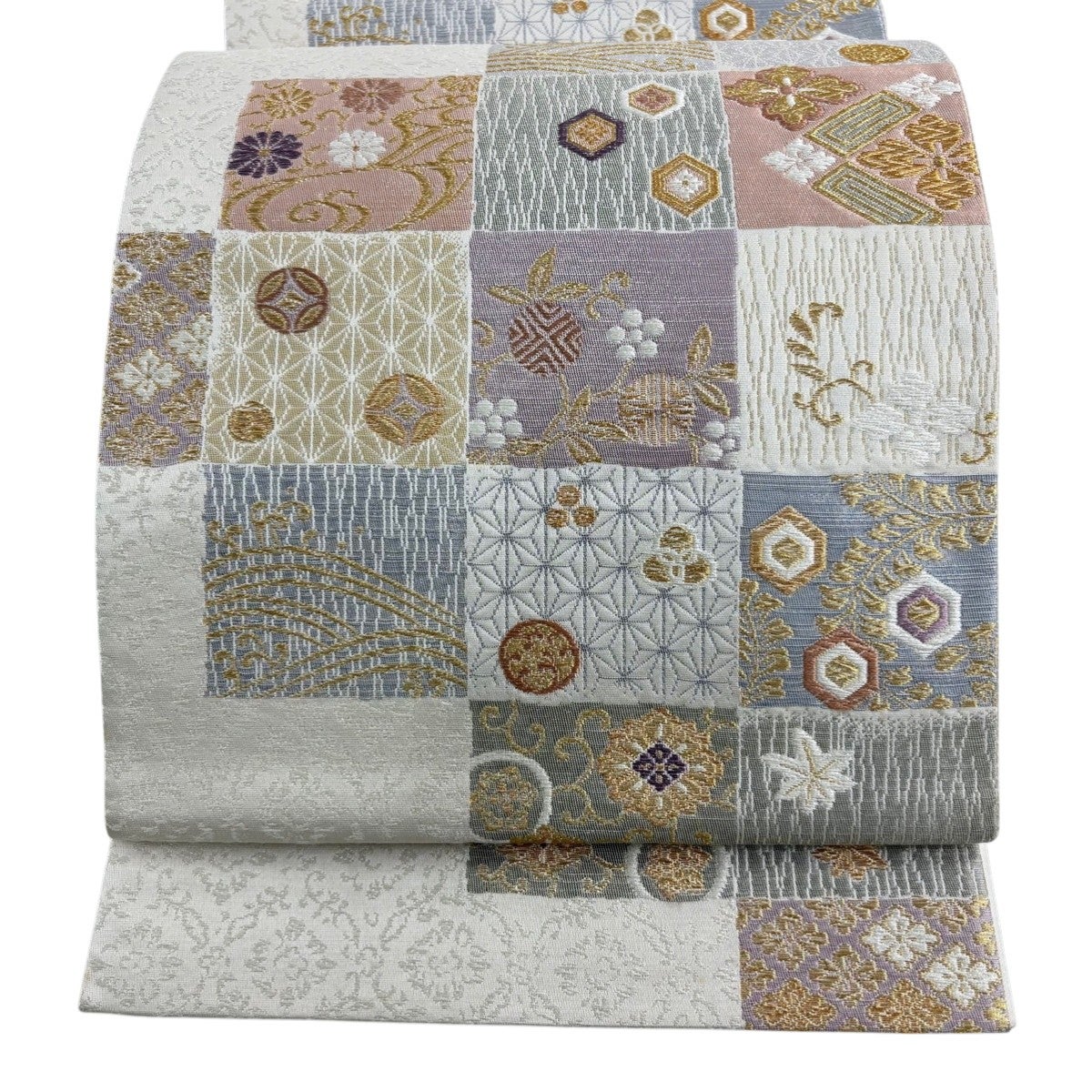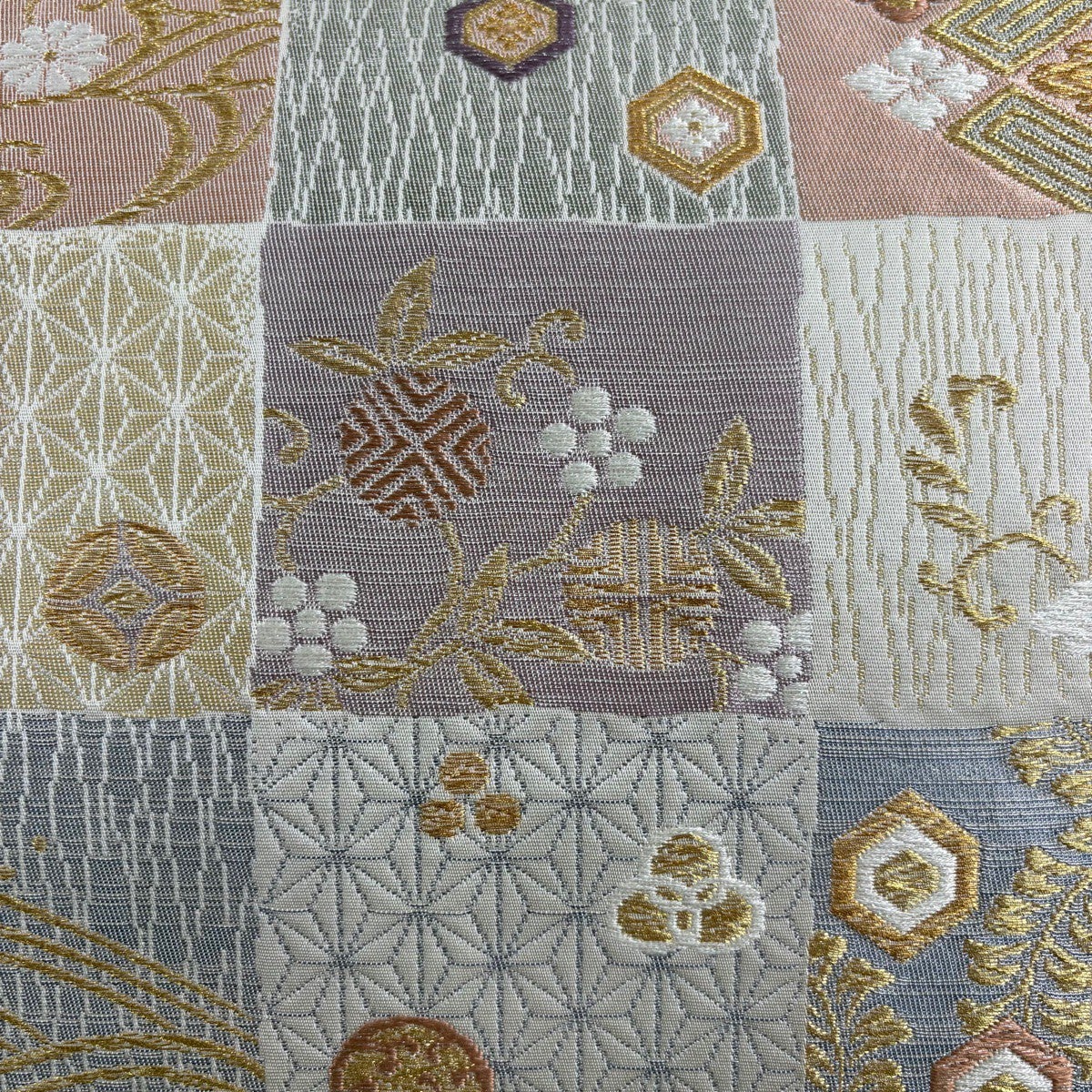 袋帯 名品 落款あり 変わり市松 金糸 灰白 六通 正絹