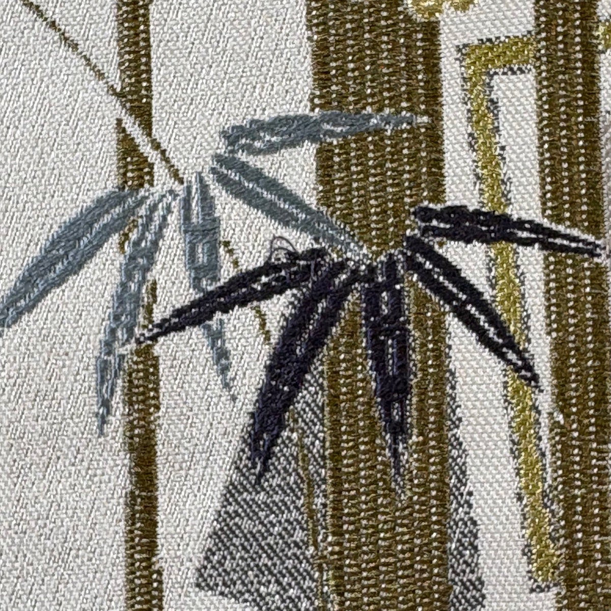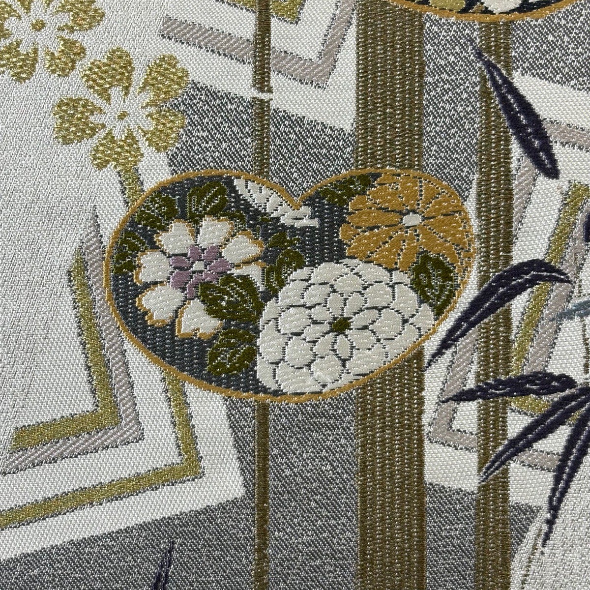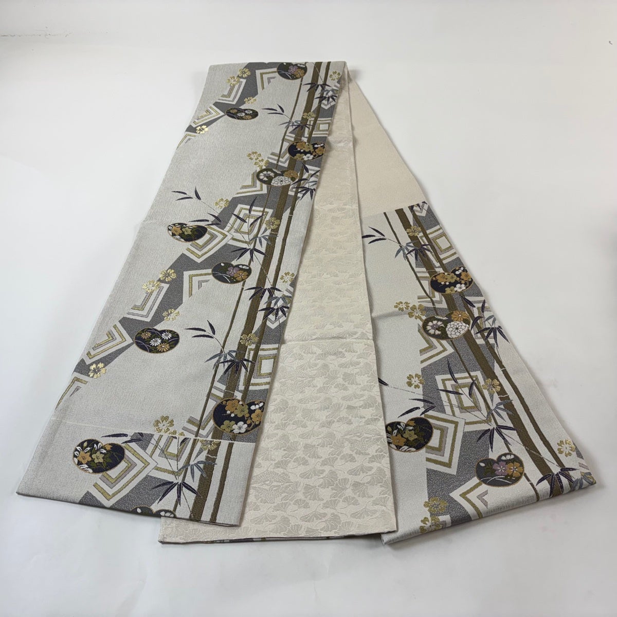 【美品】 袋帯 名品 竹梅 団扇 金銀糸 灰白 六通 正絹