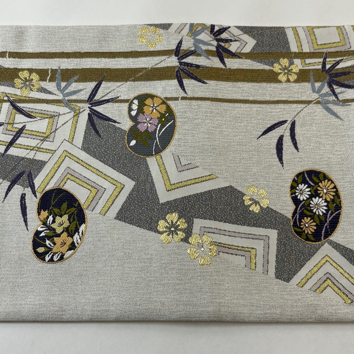 袋帯 秀品 花丸文 華文 金糸 箔 灰白 お太鼓柄 正絹