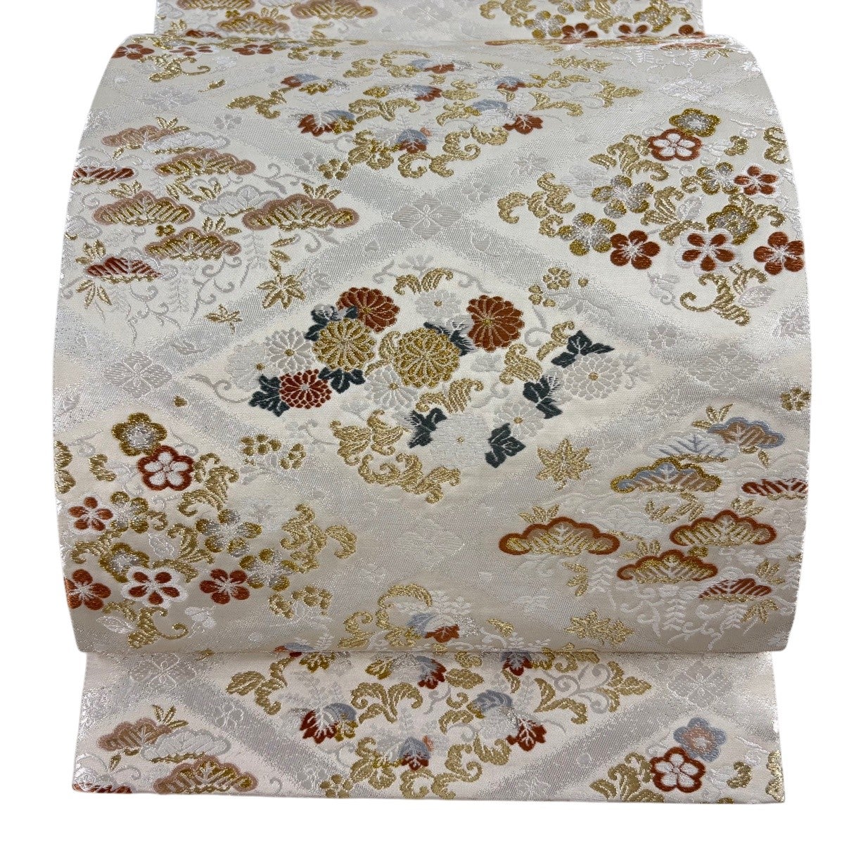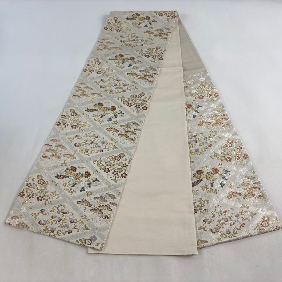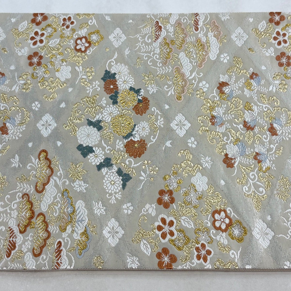 30%OFF 袋帯 秀品 菱 花 金銀糸 箔 灰白 六通 正絹 K30