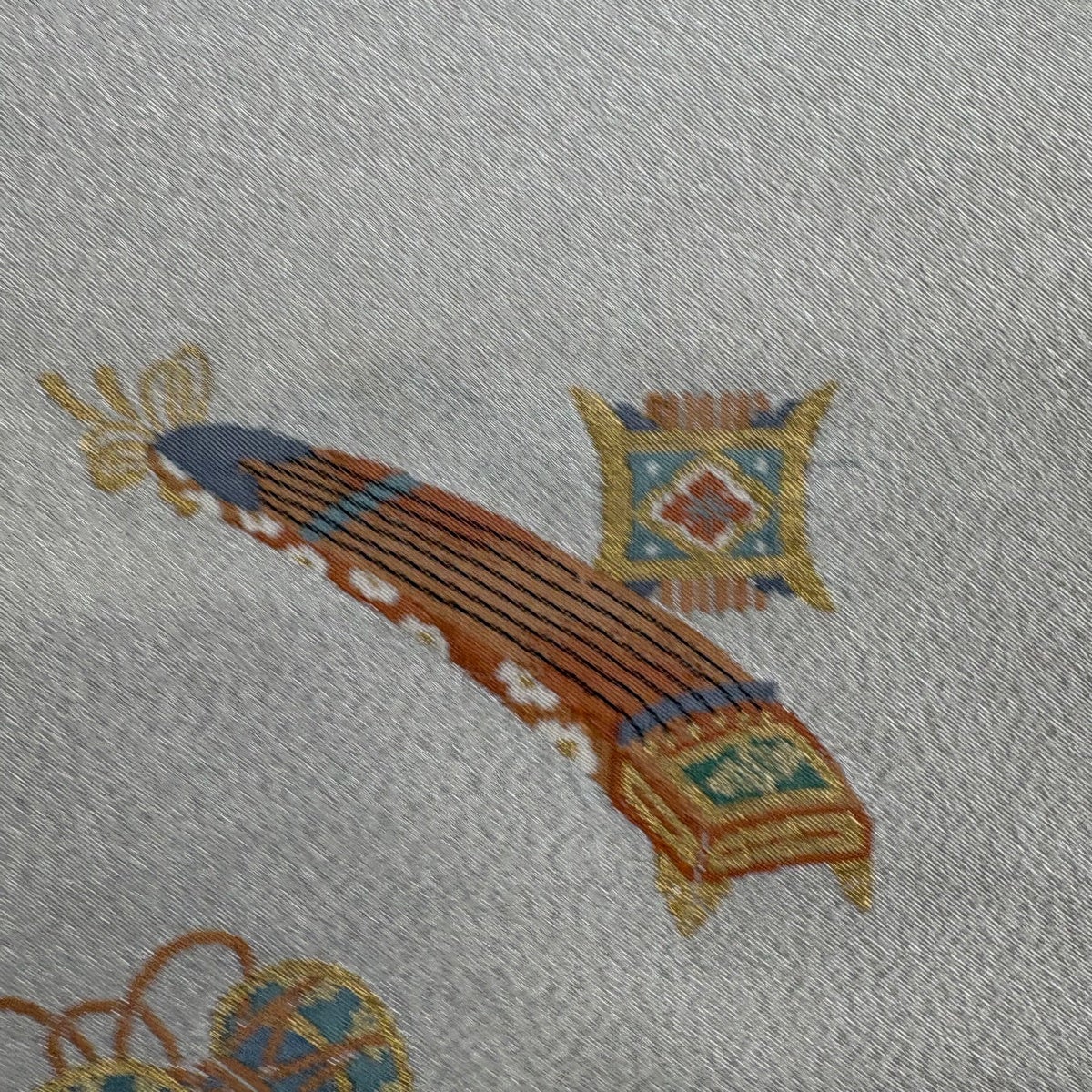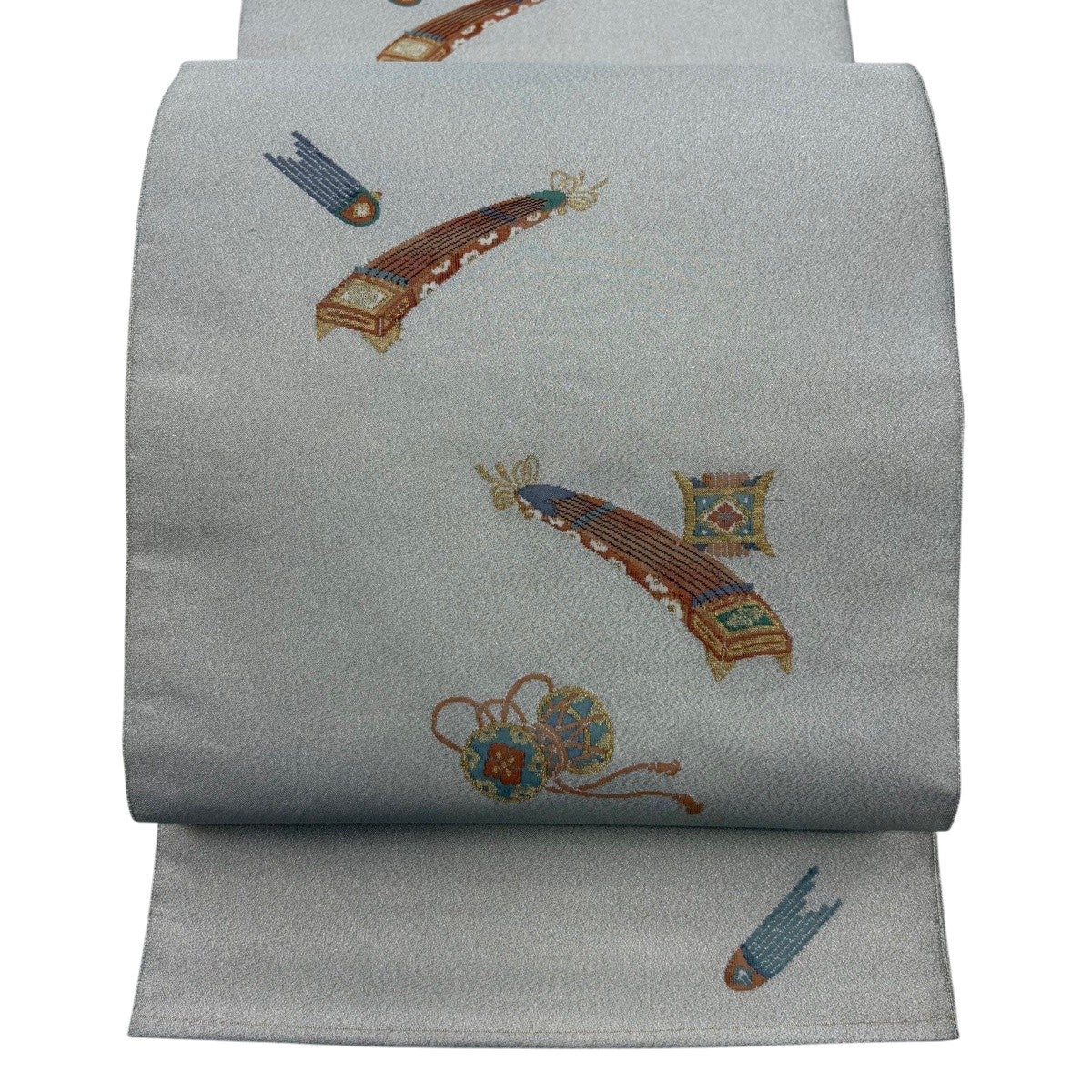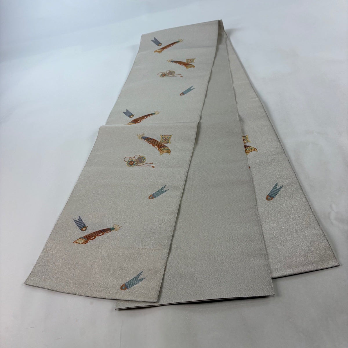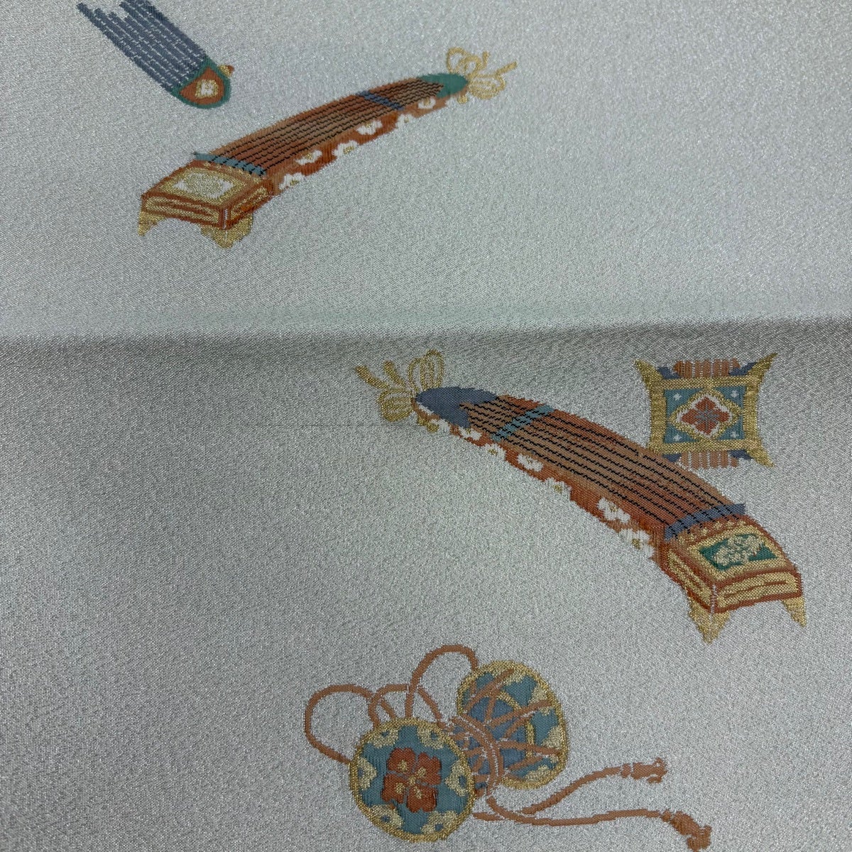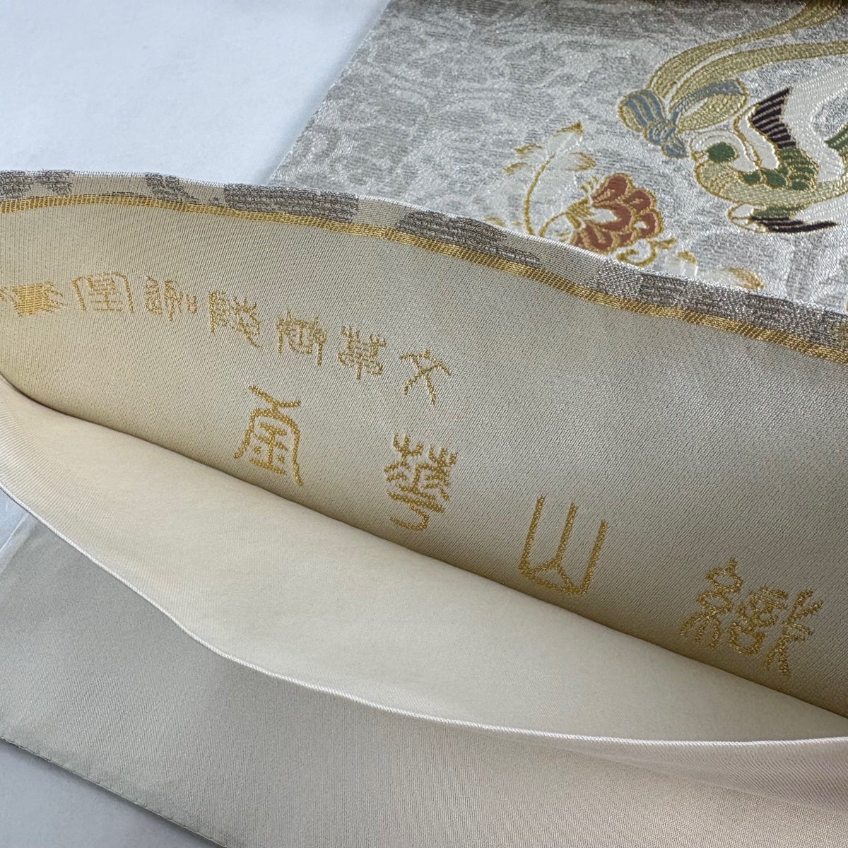 【美品】 袋帯 秀品 関西仕立て 吉祥絵図 箔 金糸 灰白 六通 正絹