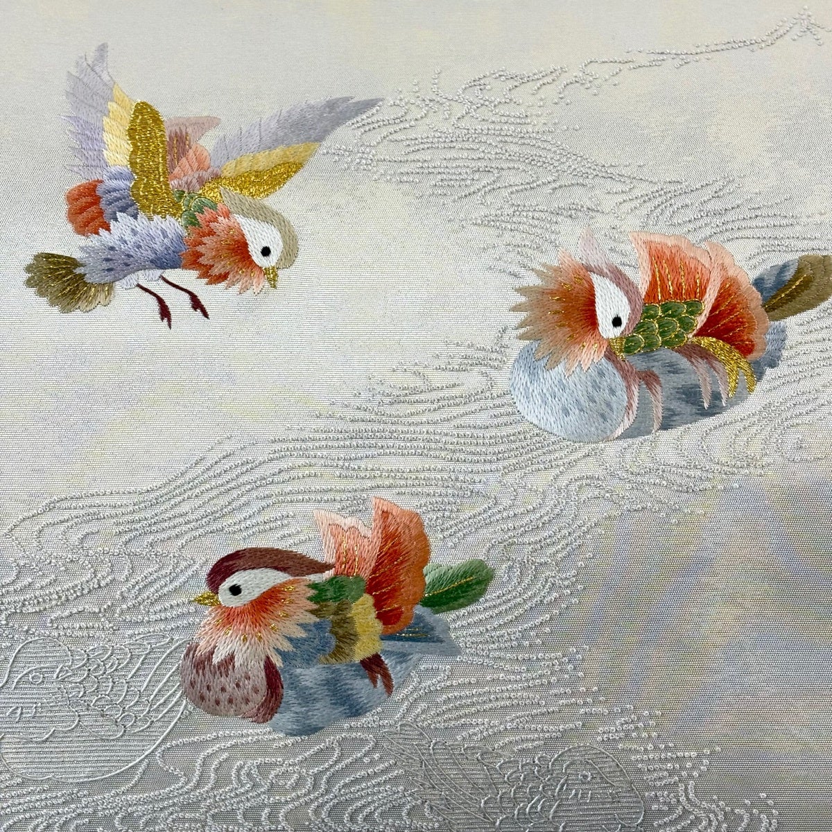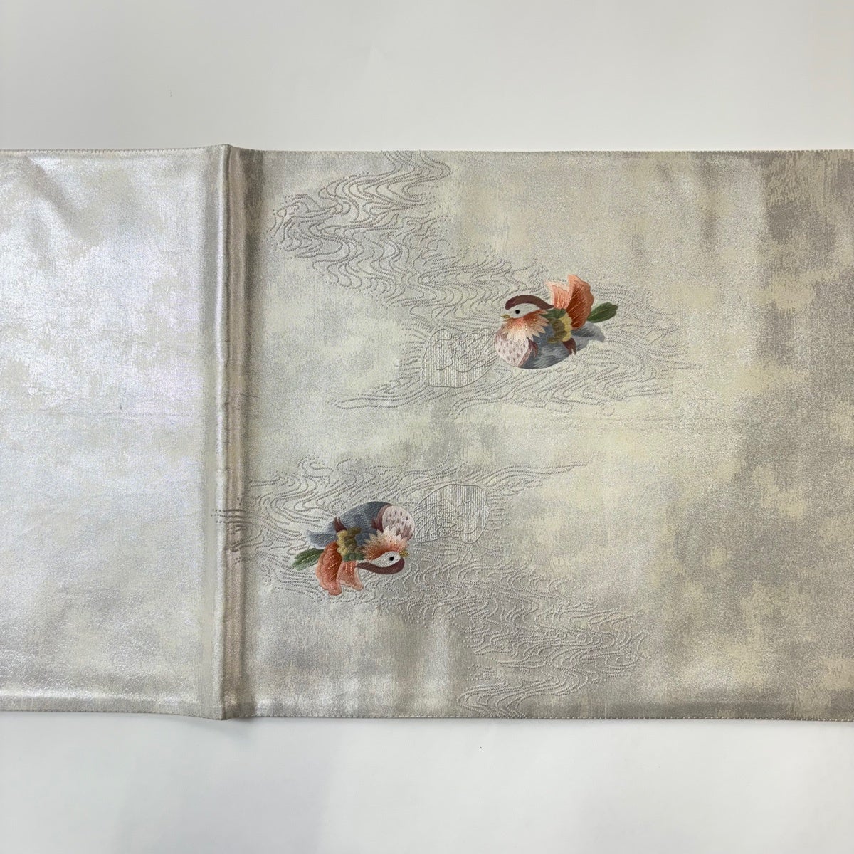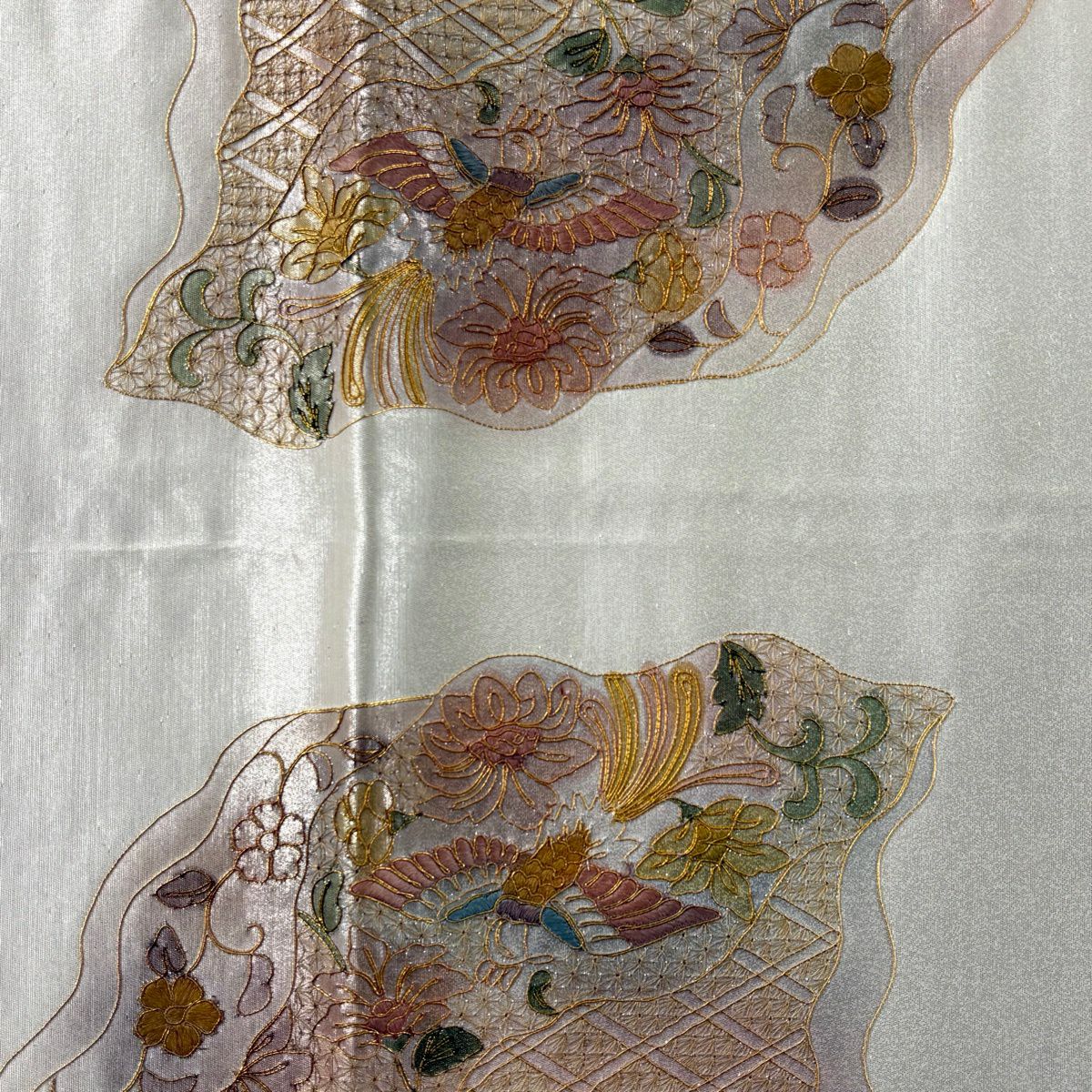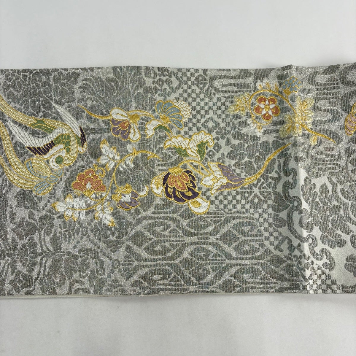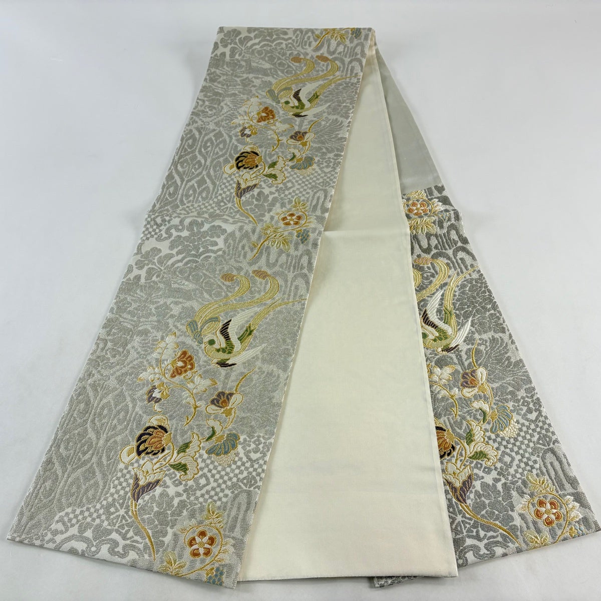 50%OFF 名古屋帯 名品 鳥 草花 金銀糸 螺鈿 灰白 正絹 K50