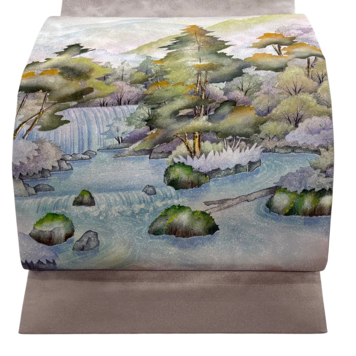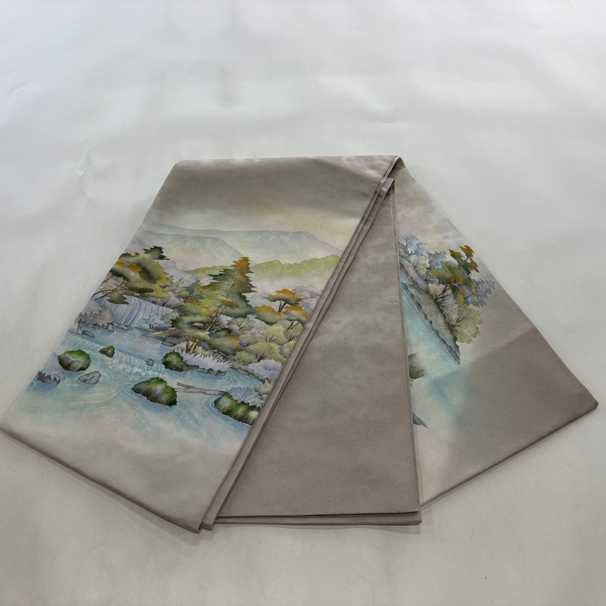 【美品】 袋帯 秀品 樹木 流水 銀通し ぼかし 灰白 お太鼓柄 正絹