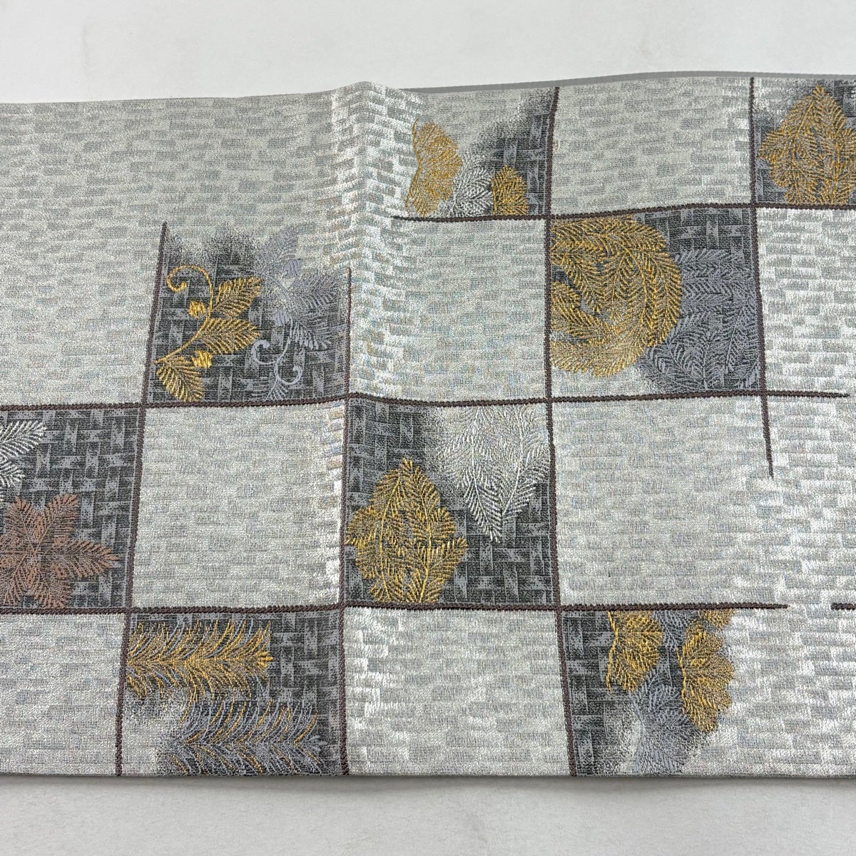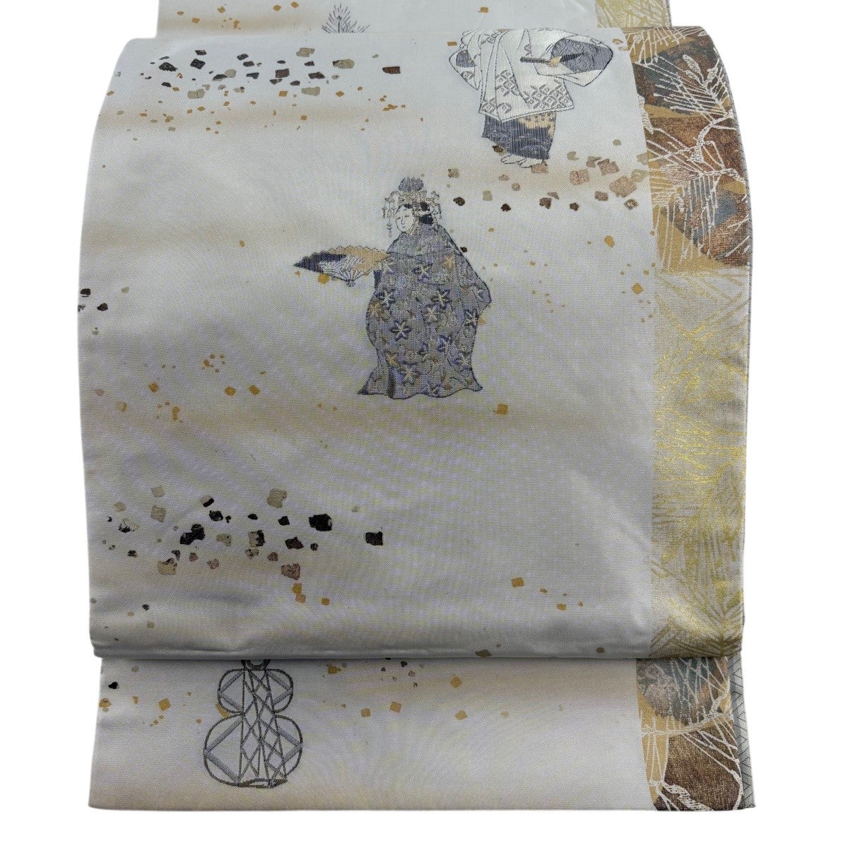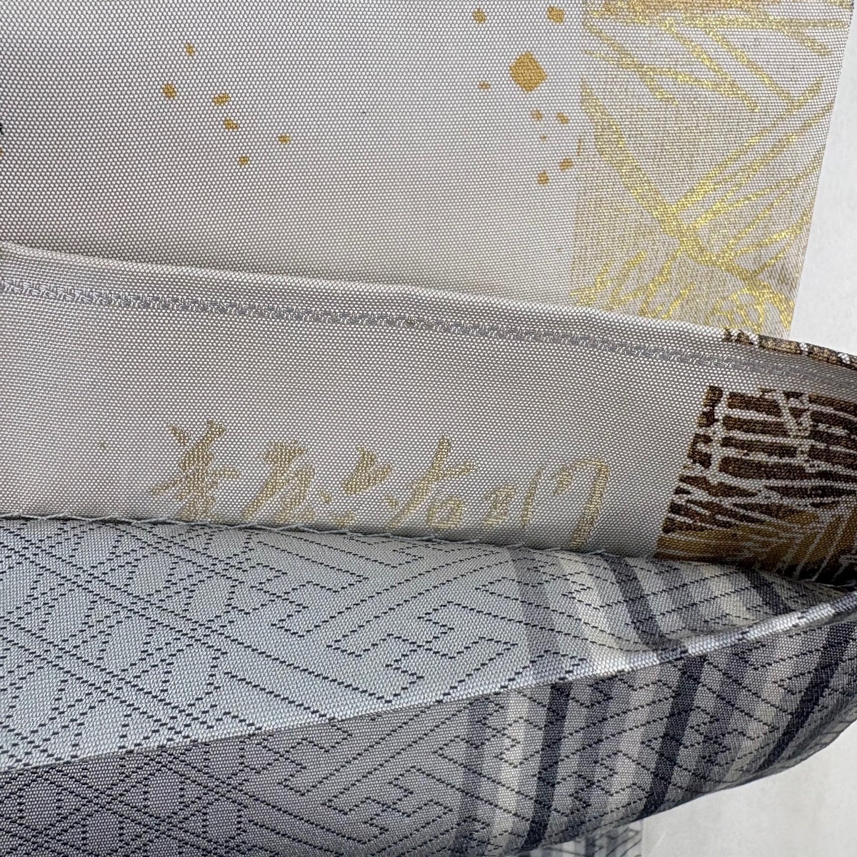 50%OFF 【美品】 袋帯 名品 幾何学 箔 灰白 六通 正絹 K50