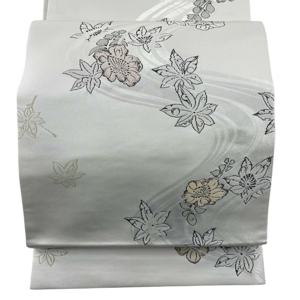 袋帯 秀品 夏帯 絽 関西仕立て 草花 流水 箔 銀糸 灰白 六通 正絹