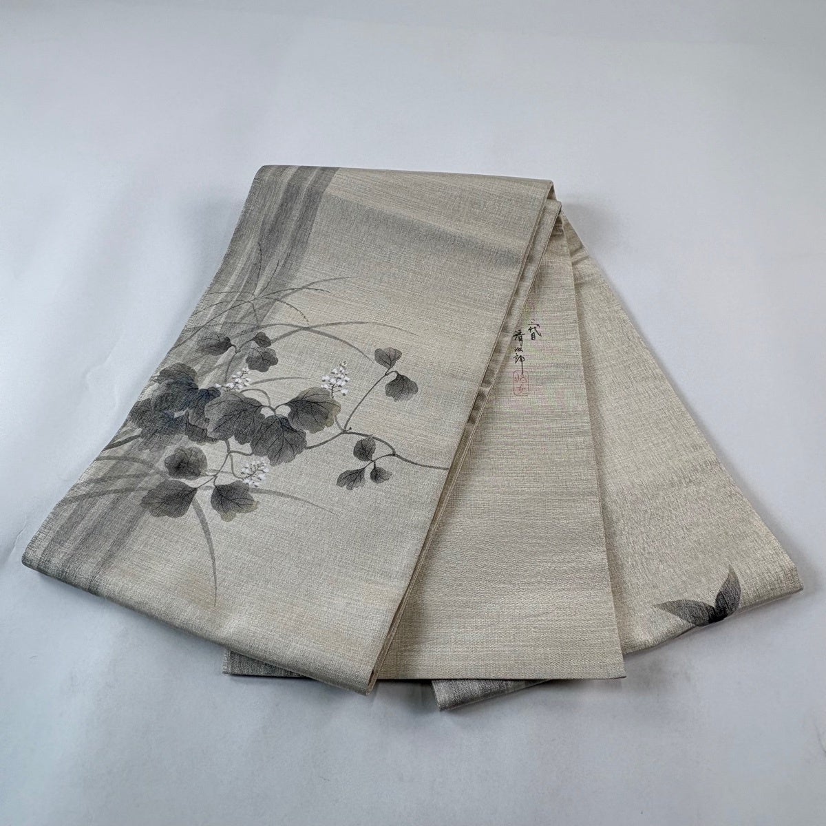 【美品】 袋帯 秀品 二代目清次郎 落款あり 草花 銀通し 灰白 お太鼓柄 正絹