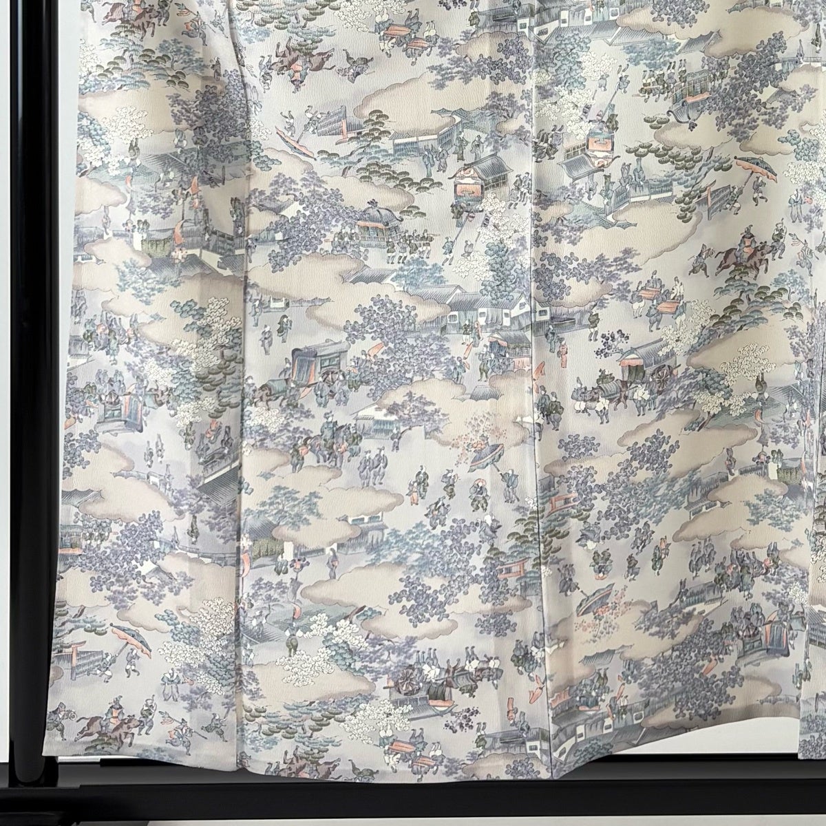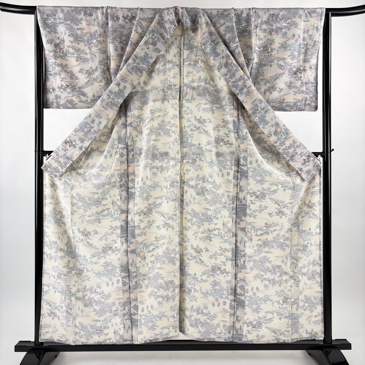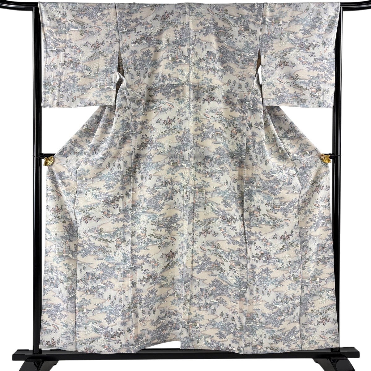 【美品】 小紋 身丈156cm 裄丈66cm M 単衣 風景 雲文 灰白 正絹 優品