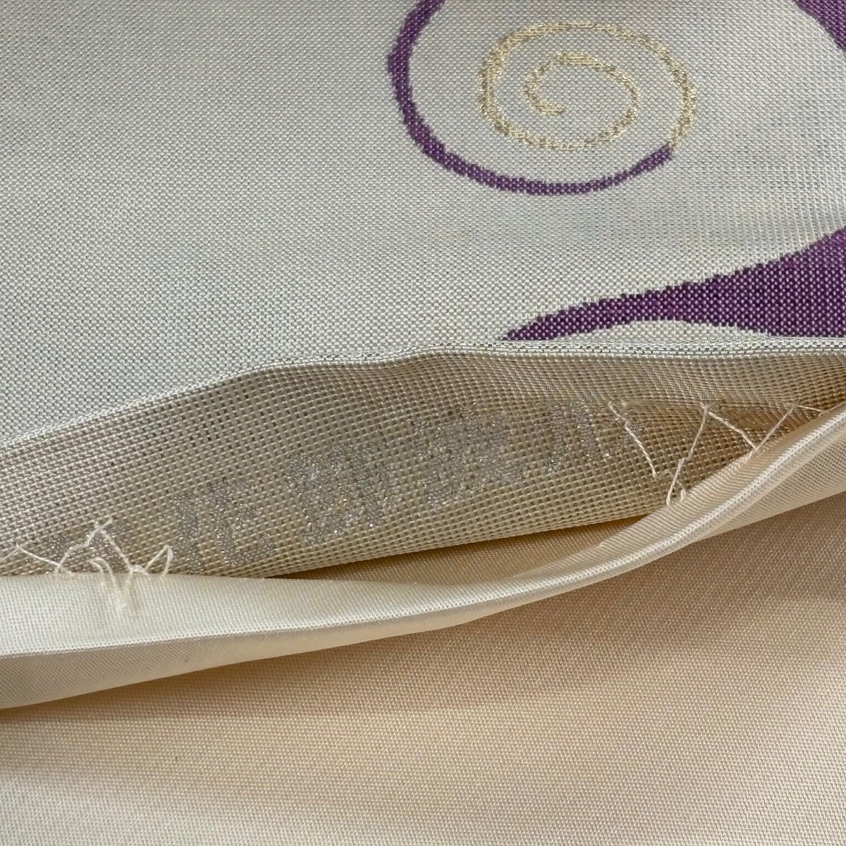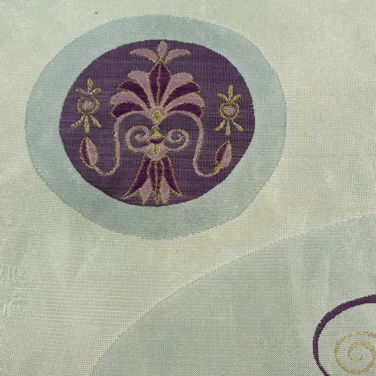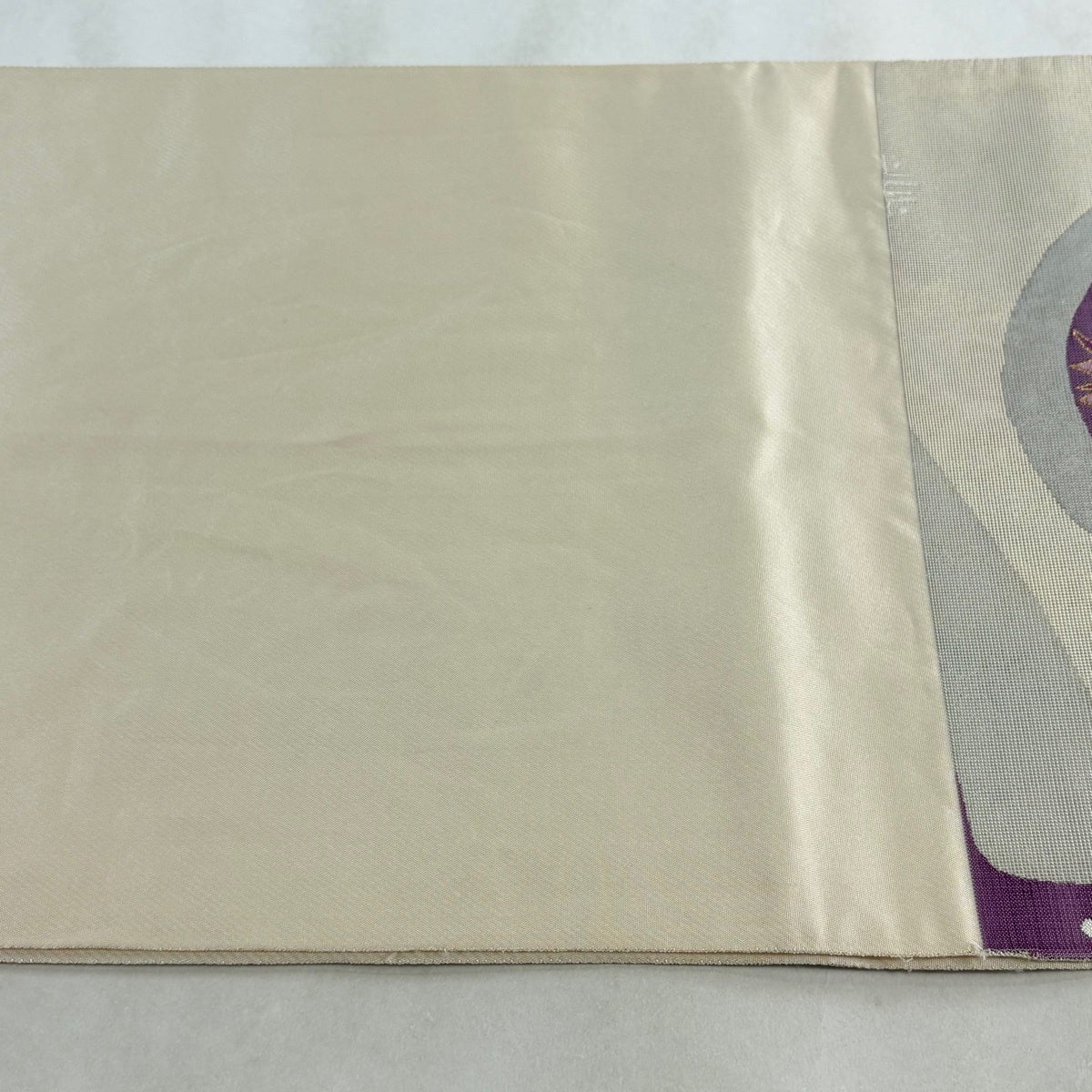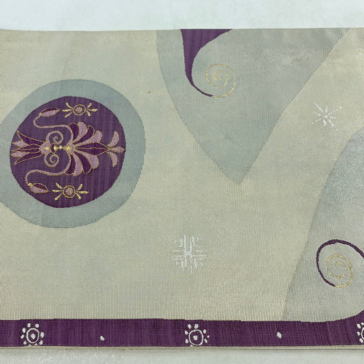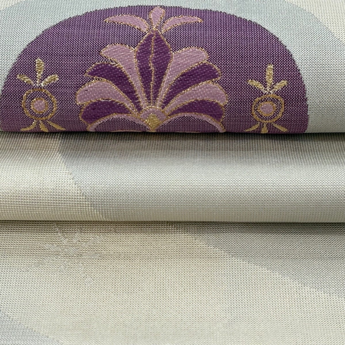 袋帯 逸品 落款あり 帝王紫 草花飾波形文 幾何学 金糸 箔 灰白 六通 正絹