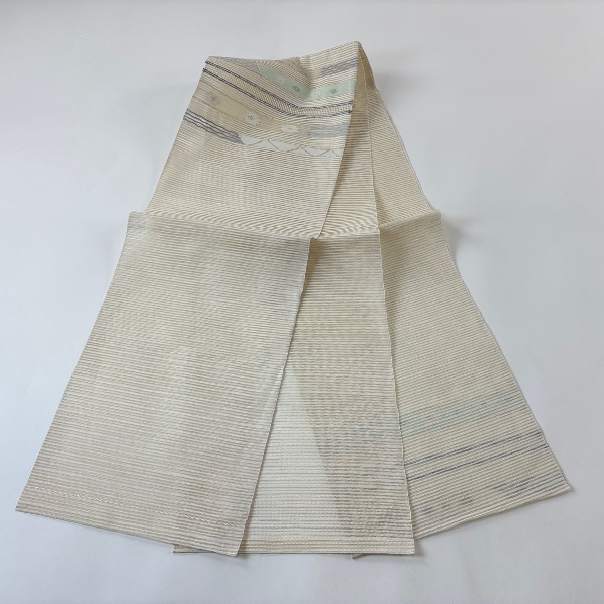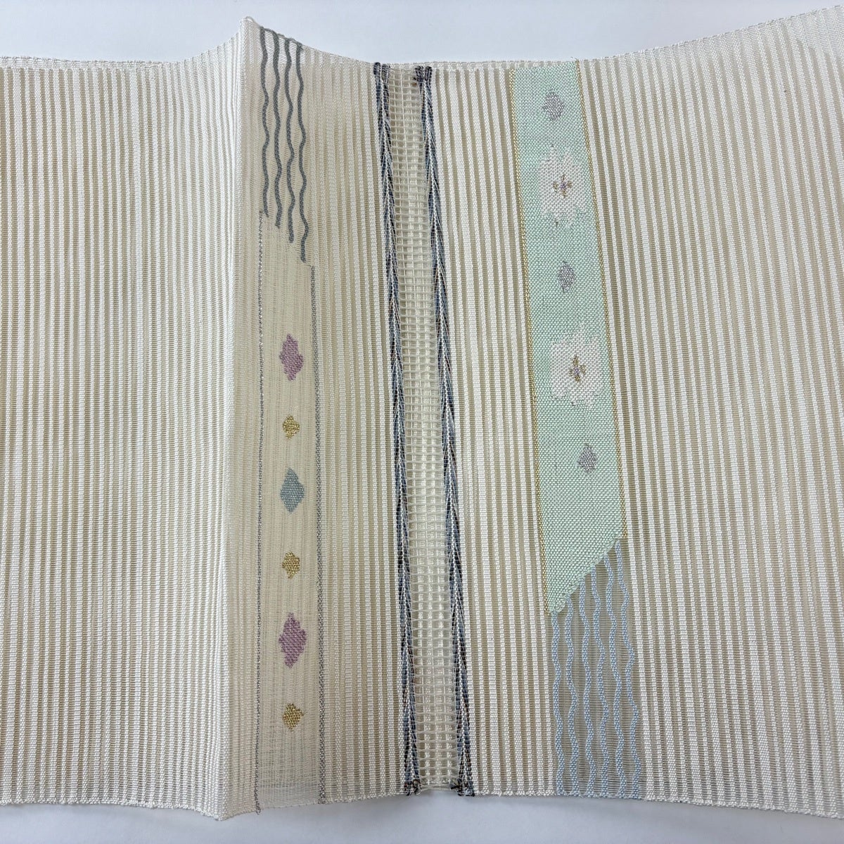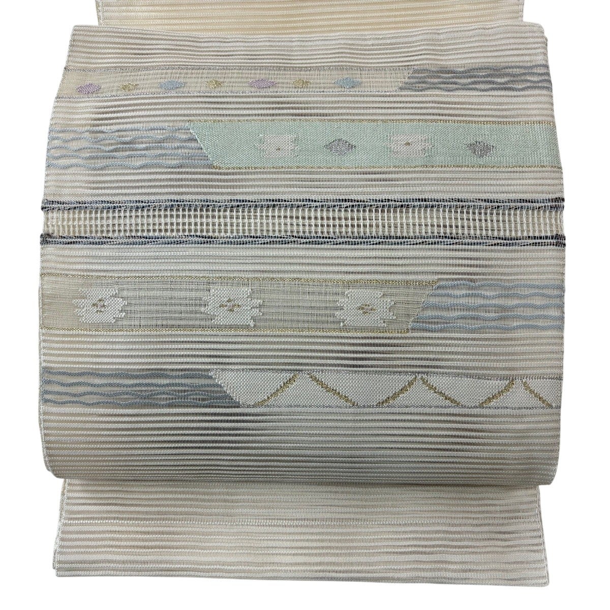 50%OFF 名古屋帯 秀品 夏帯 流水 よろけ縞 金銀糸 灰白 正絹 K50