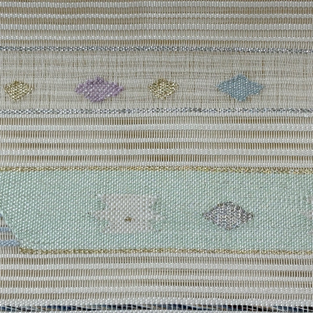 【美品】 名古屋帯 秀品 夏帯 八寸名古屋帯 絽 横段 幾何学模様 金銀糸 灰白 正絹