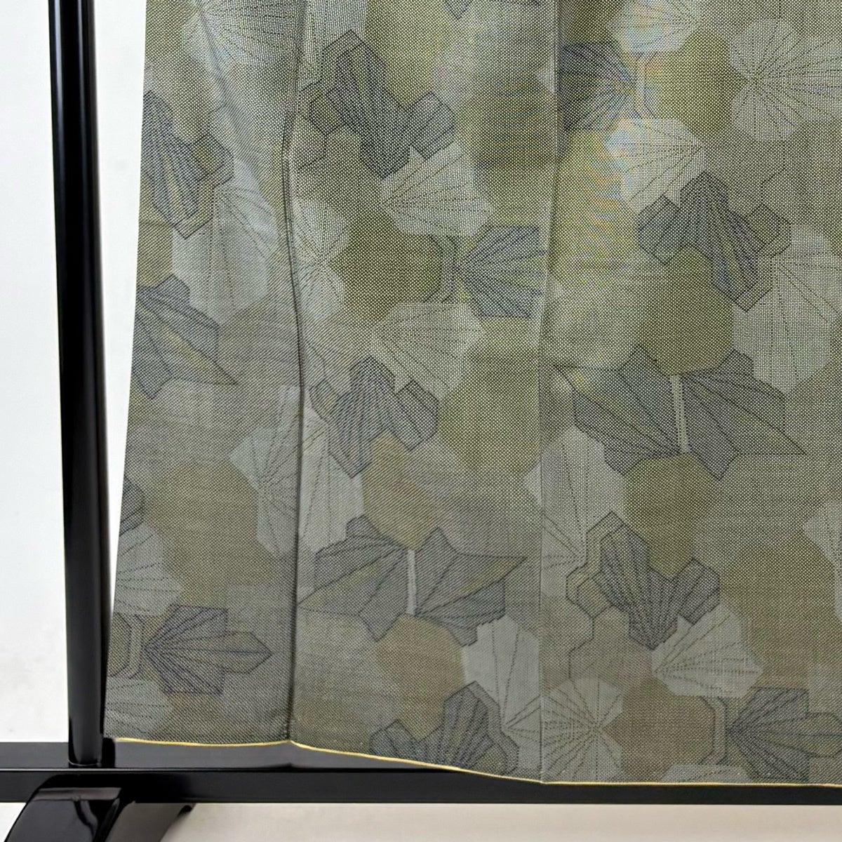 紬 身丈165.5cm 裄丈67.5cm L 袷 亀甲 縞 灰緑 正絹 秀品