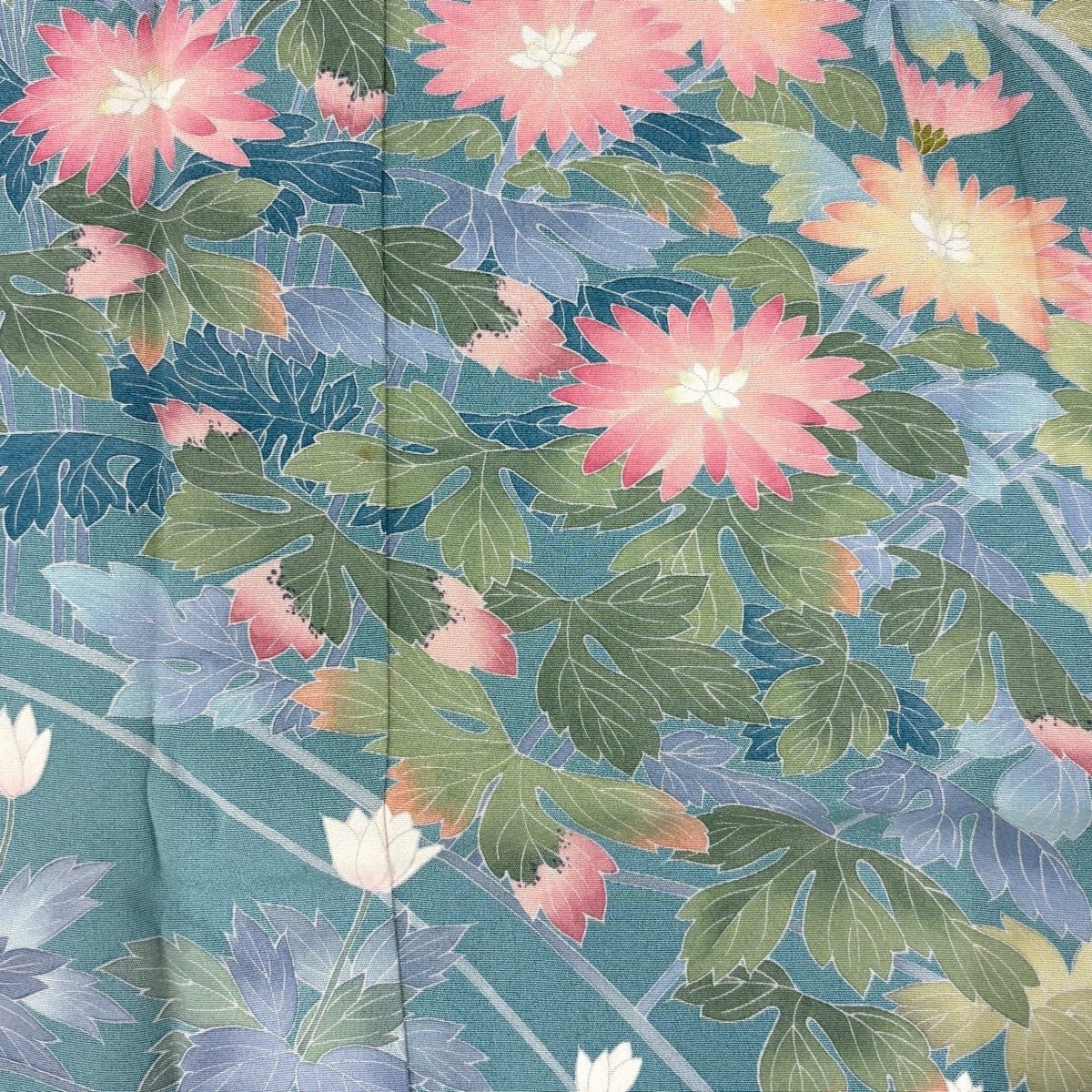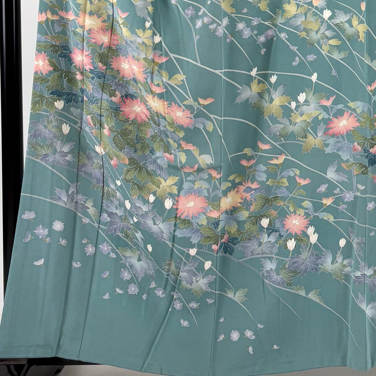 付下げ 身丈157.5cm 裄丈65cm M 袷 草花 道長取 ぼかし 灰緑 正絹 秀品