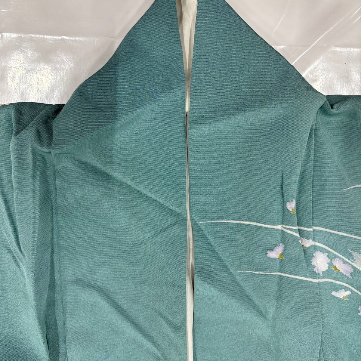 付下げ 身丈164cm 裄丈67cm M 袷 扇面 草花 刺繍 絞り 灰緑 正絹 秀品