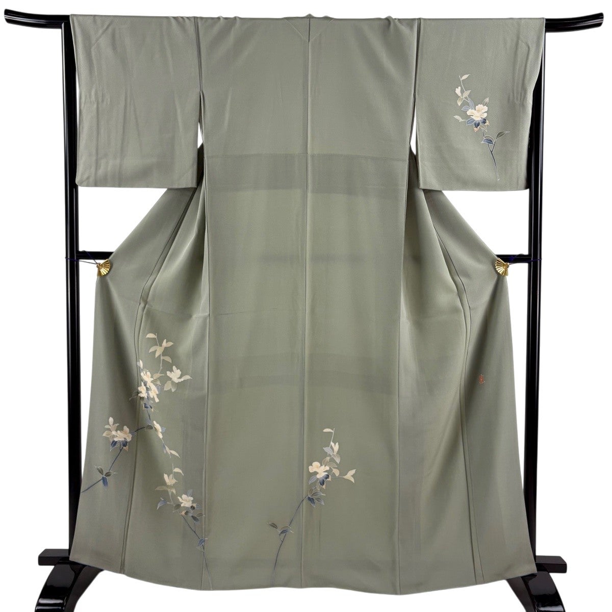 付下げ 身丈165cm 裄丈65.5cm M 袷 南克治 落款あり 枝花 灰緑 正絹 秀品