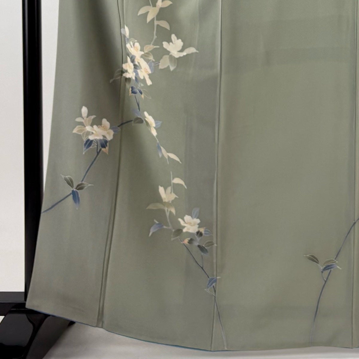 訪問着 身丈171cm 裄丈67.5cm L 袷 枝花 流水 金糸 金彩 灰緑 正絹 秀品
