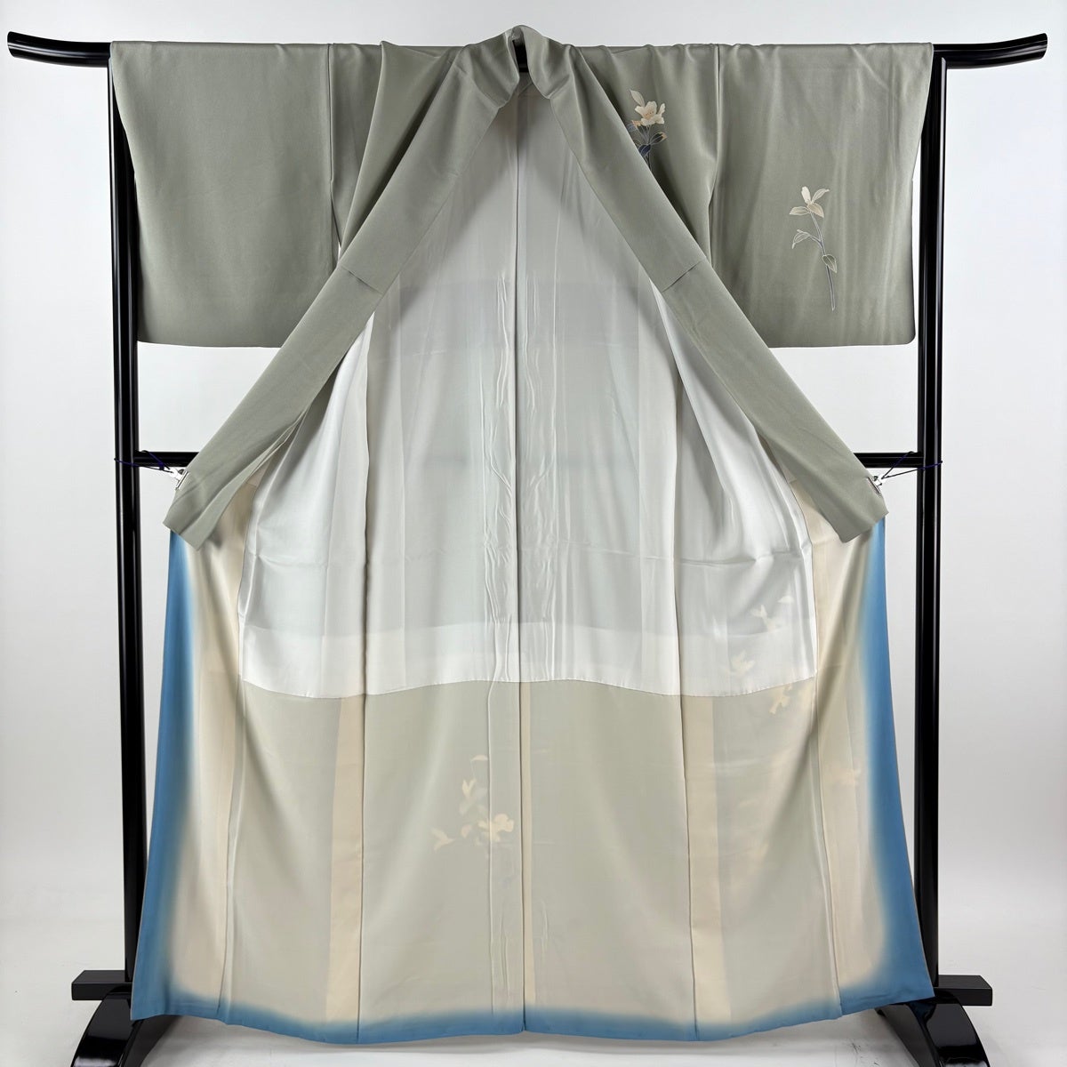 訪問着 身丈154cm 裄丈64cm M 袷 草花 流水 金彩 ぼかし 灰緑 正絹 名品