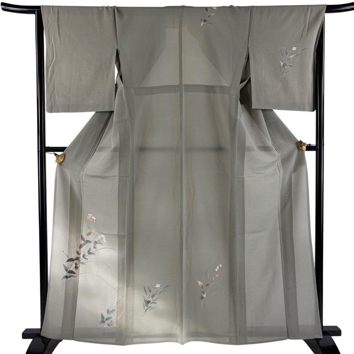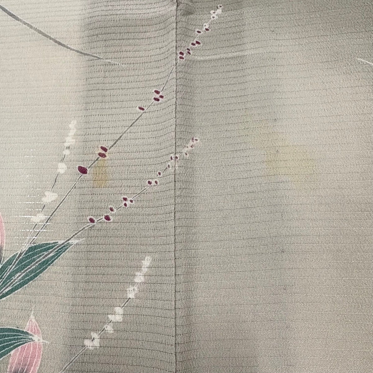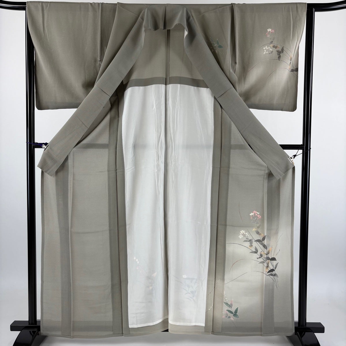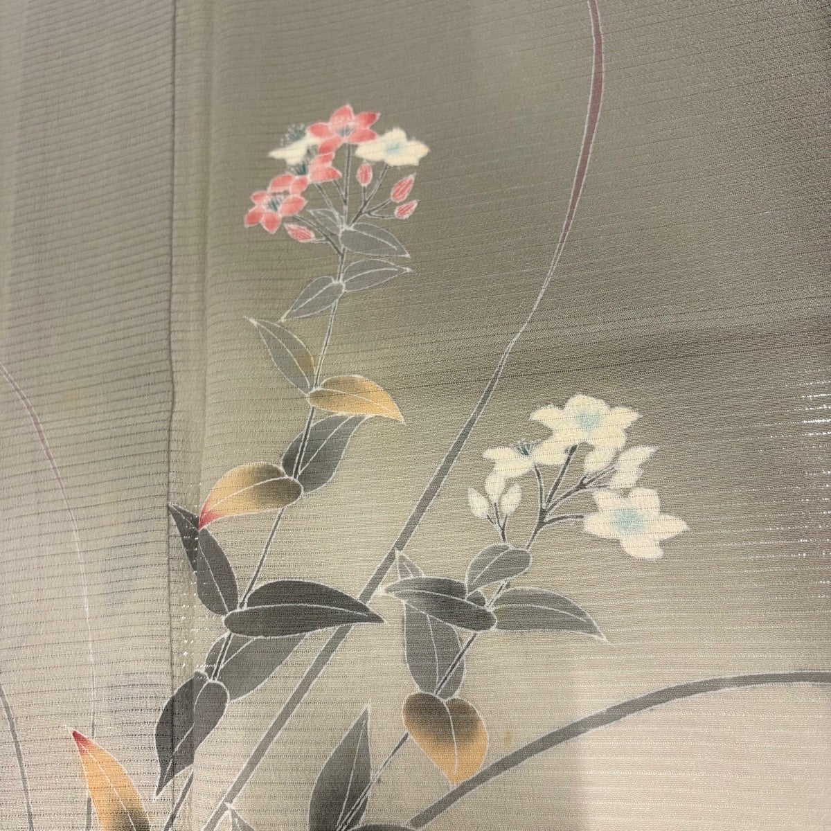 訪問着 身丈155cm 裄丈62.5cm S 単衣 秋草 草花 ぼかし 灰緑 正絹 秀品