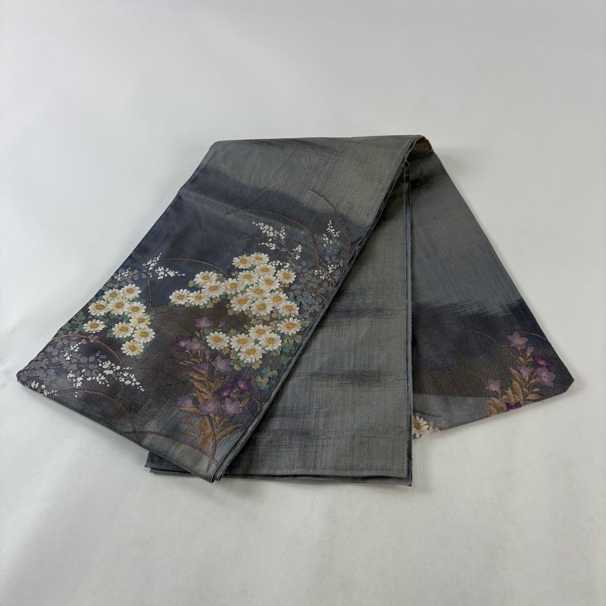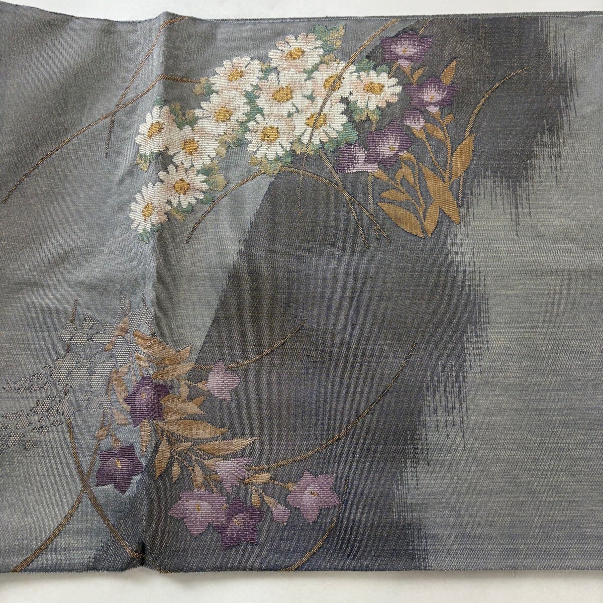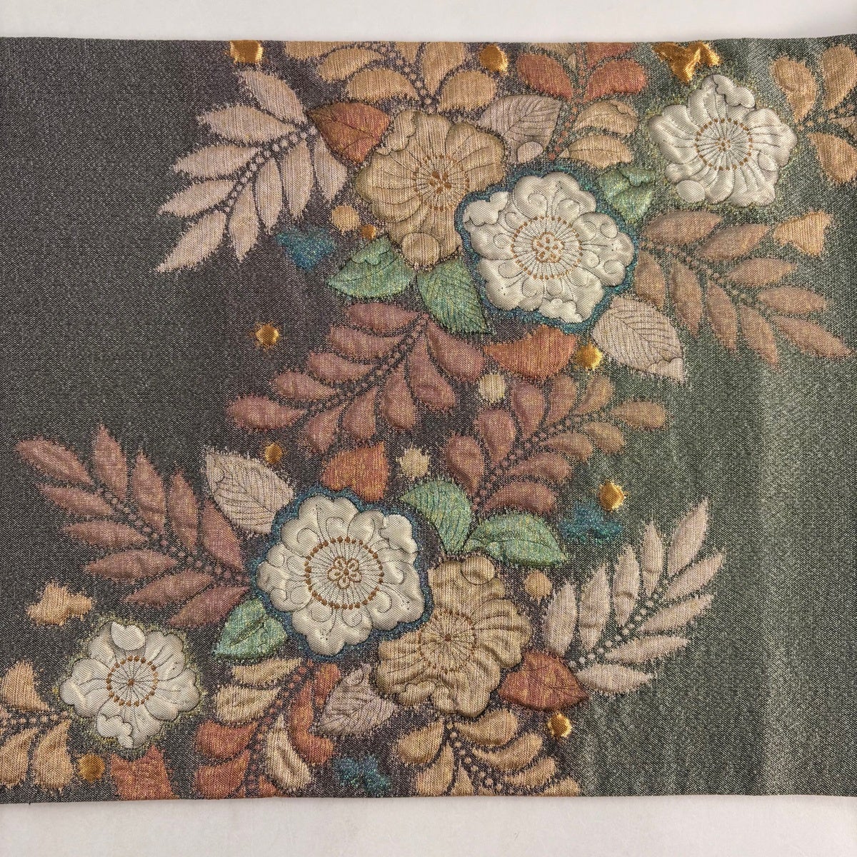 袋帯 秀品 ワンポイント柄 草花 箔 螺鈿 灰緑 六通 正絹