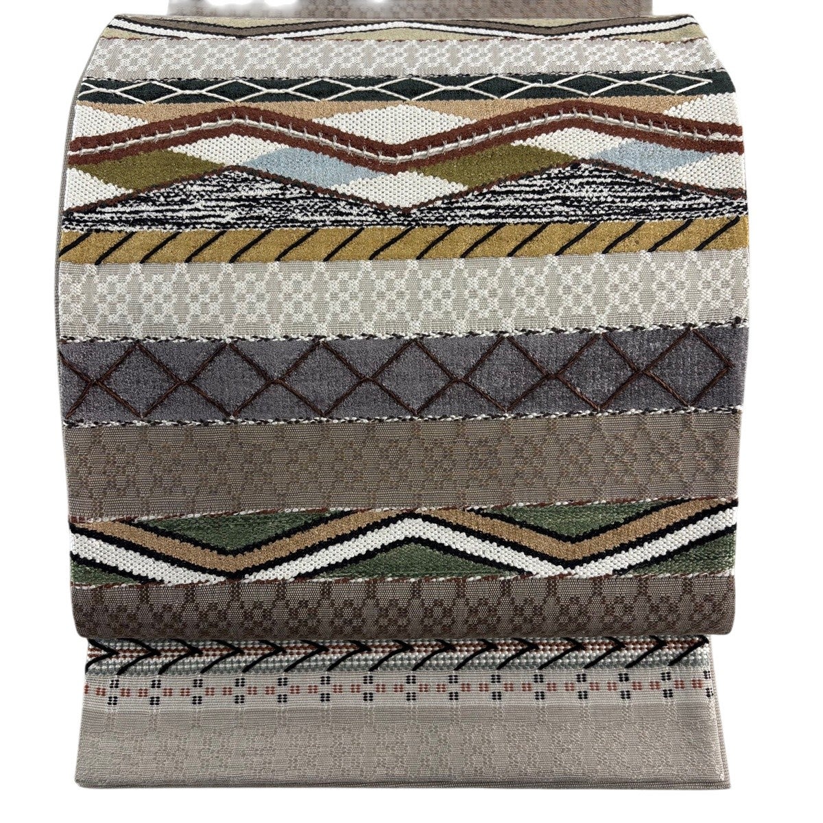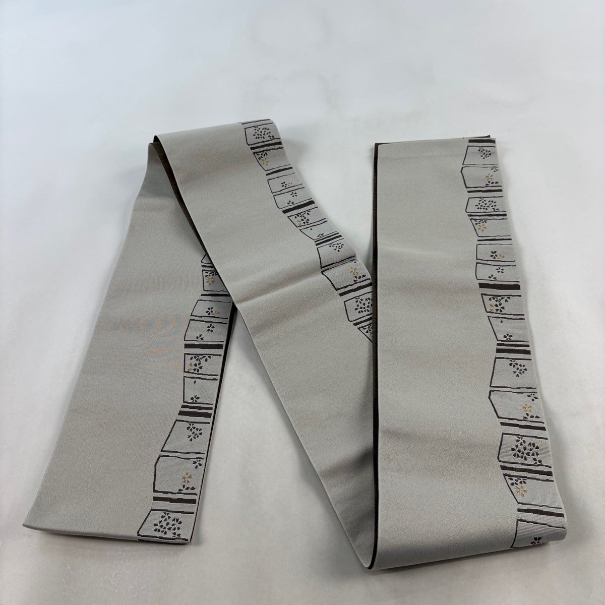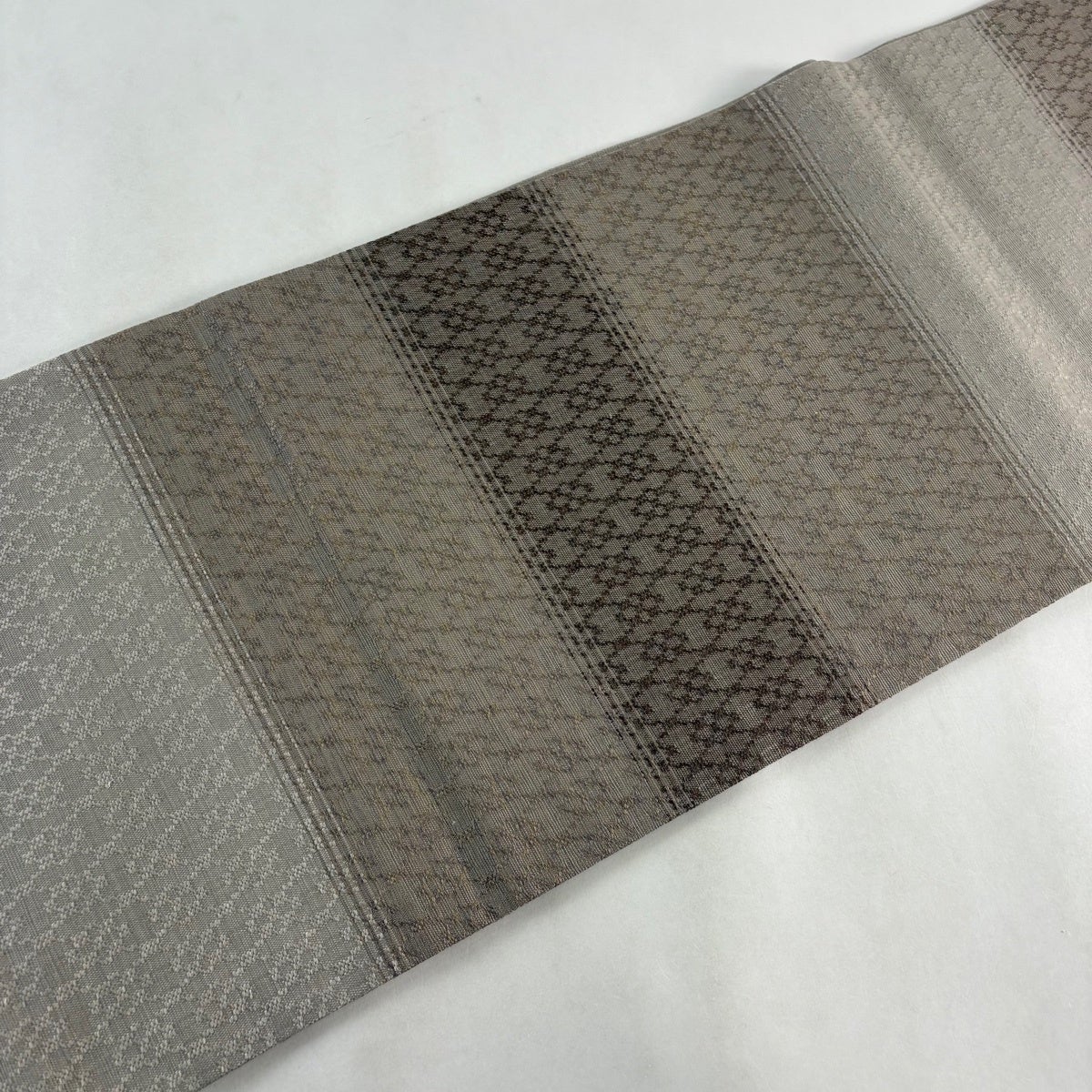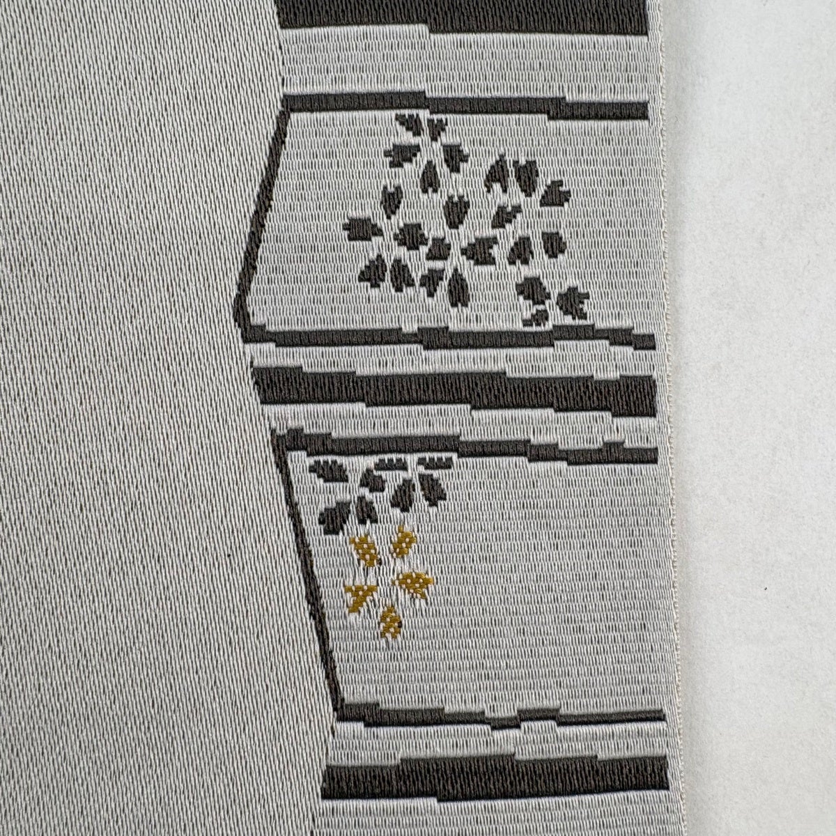 【美品】 袋帯 秀品 紬地 幾何学模様 灰茶 全通 正絹