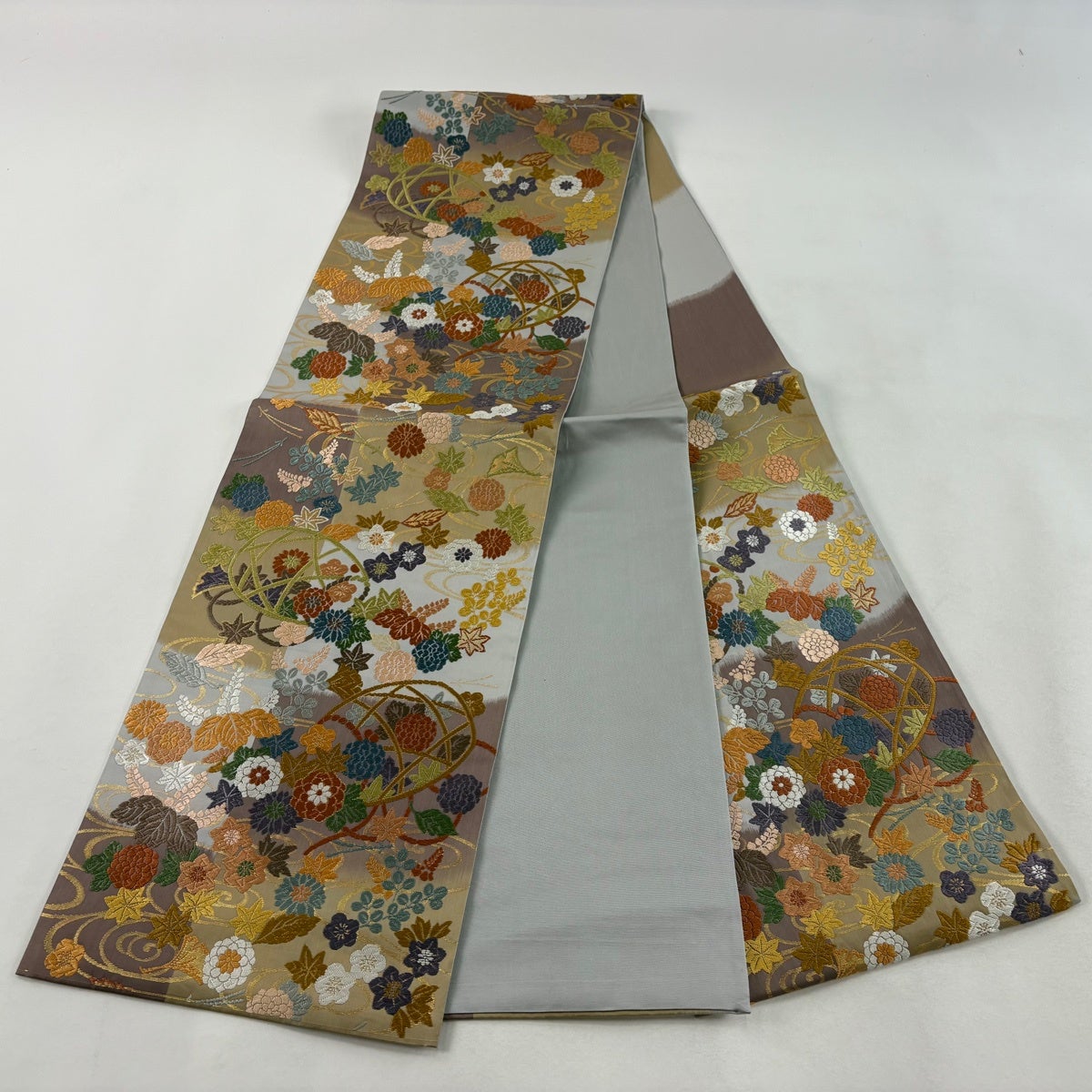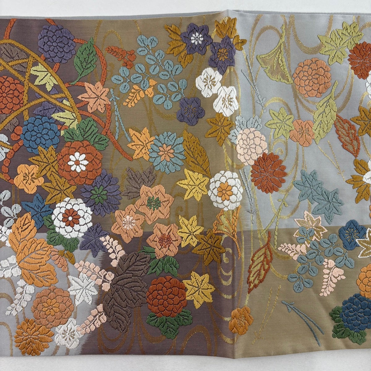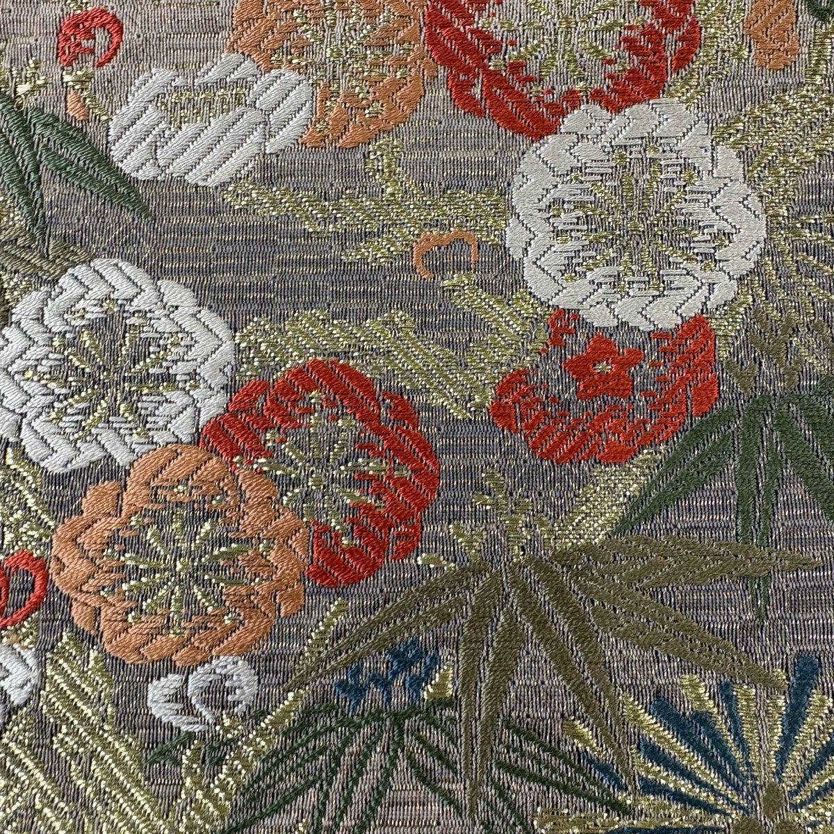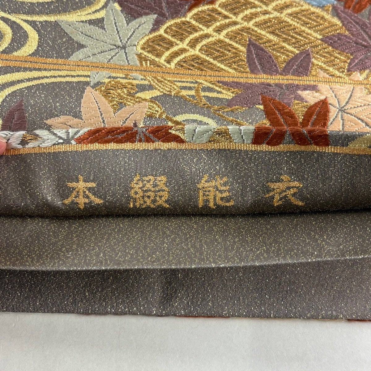袋帯 秀品 花寿彩映文 金糸 ラメ糸 灰茶 六通 正絹