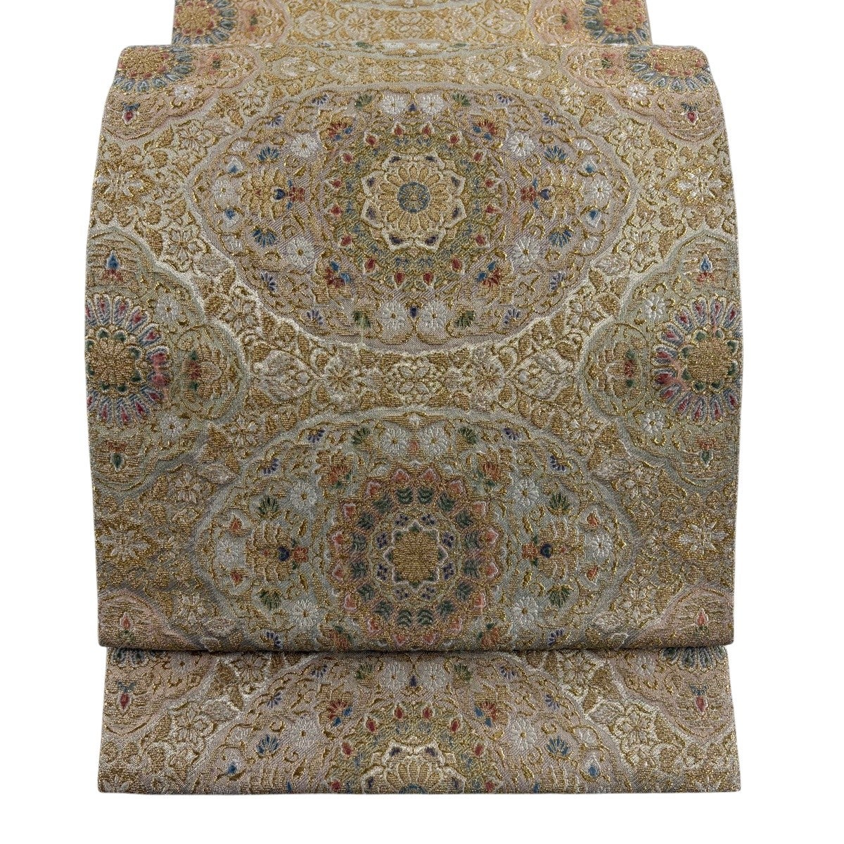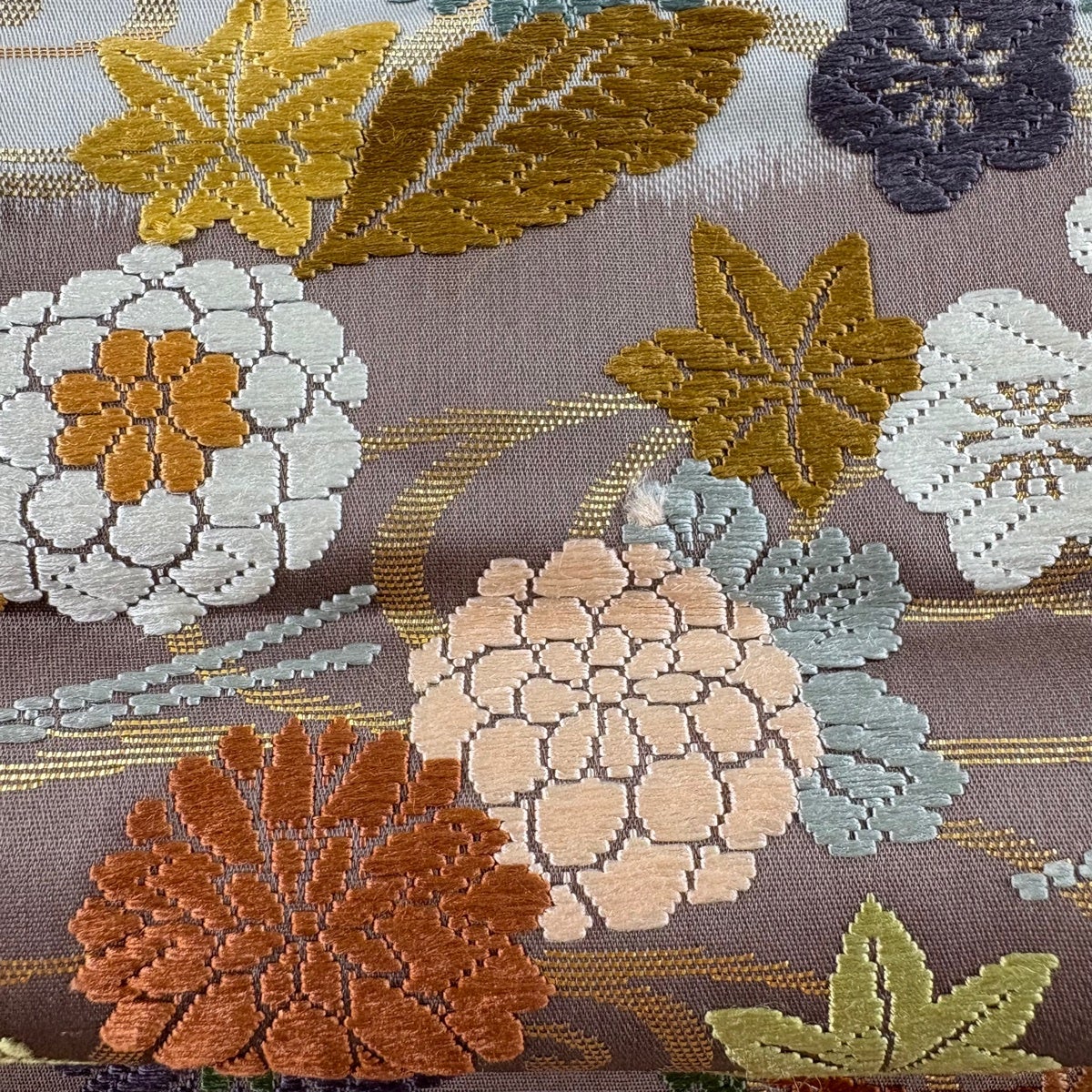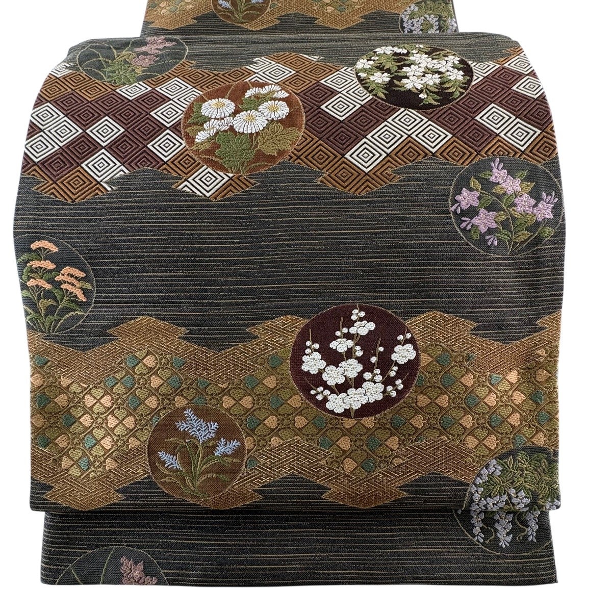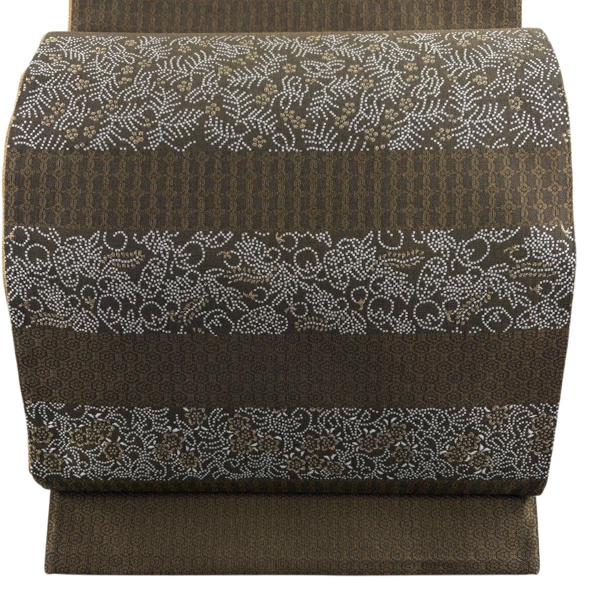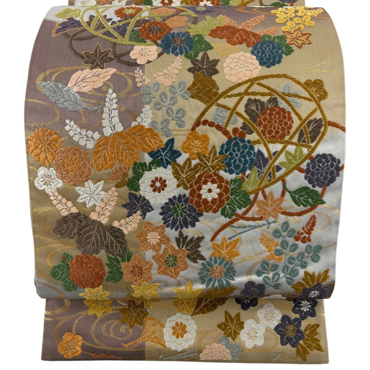 袋帯 秀品 花寿彩映文 金糸 ラメ糸 灰茶 六通 正絹