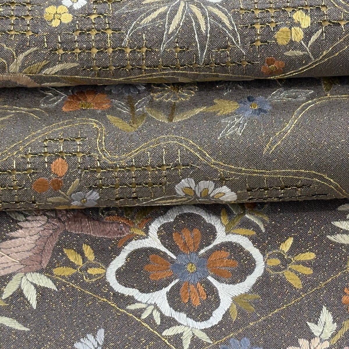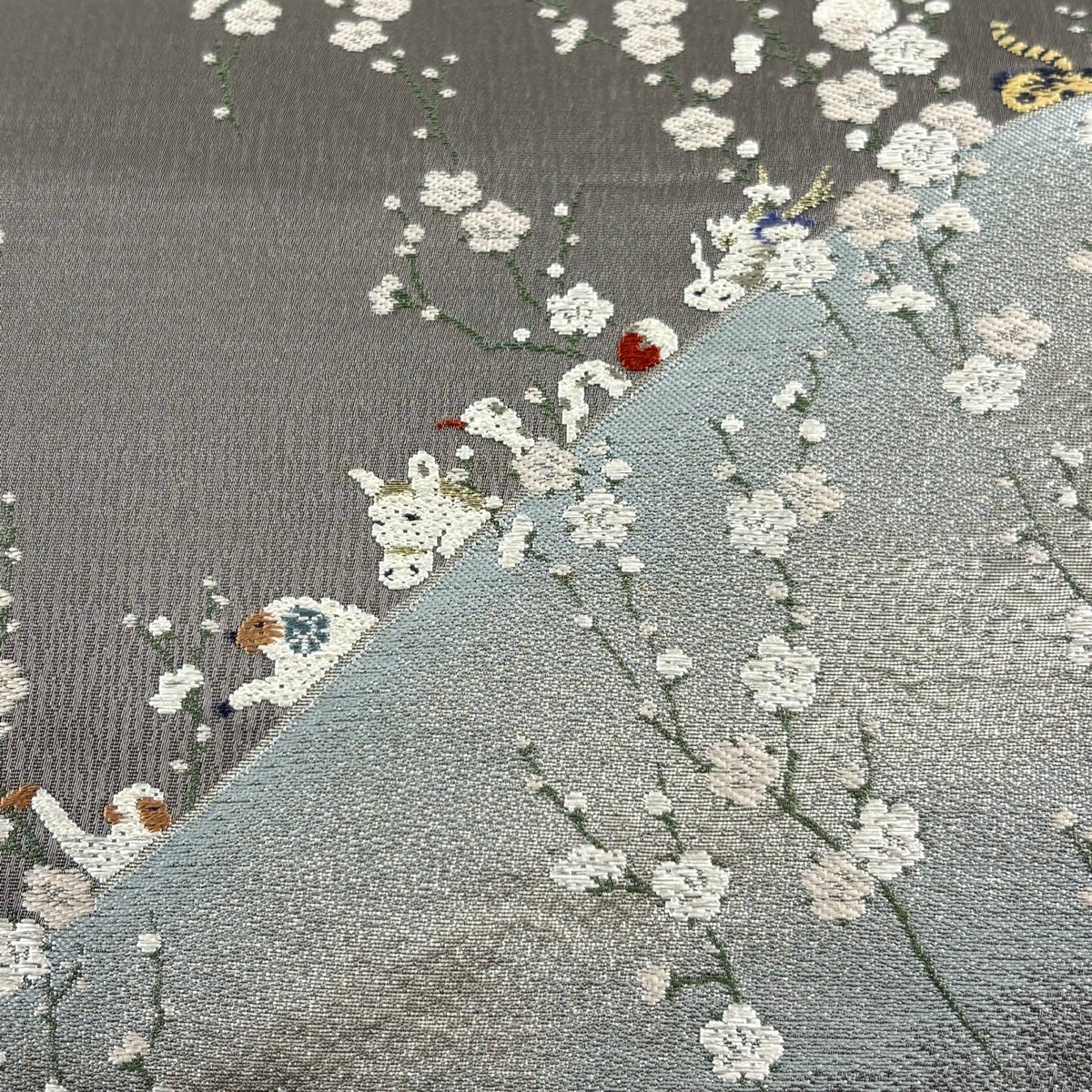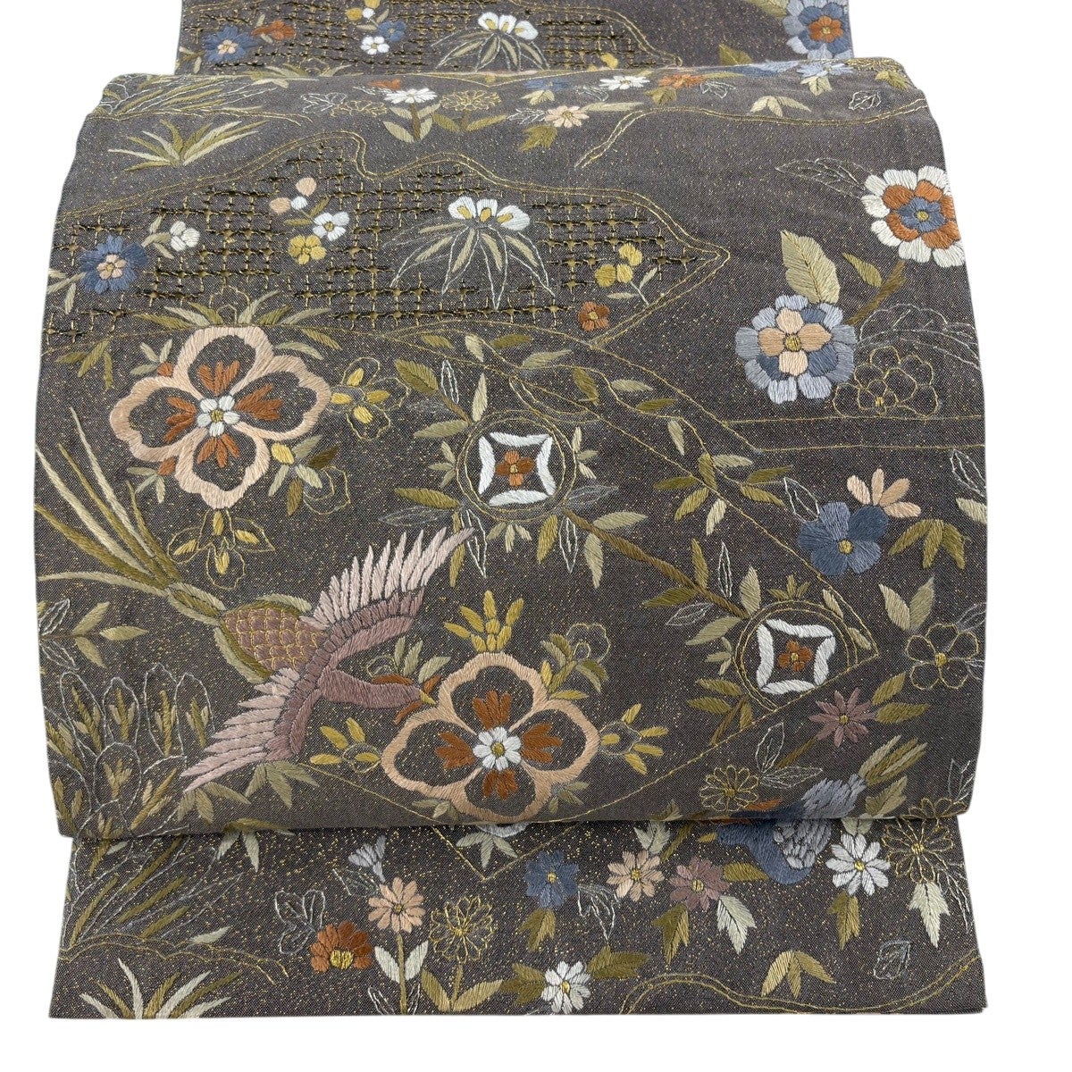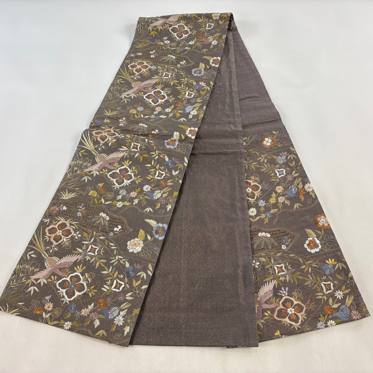 袋帯 逸品 花鳥 華文 金銀糸 刺繍 灰茶 六通 正絹