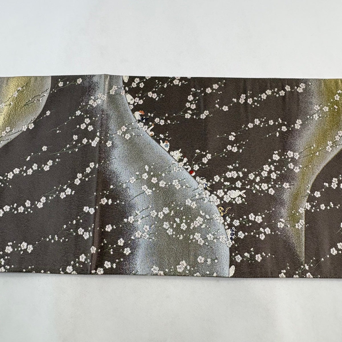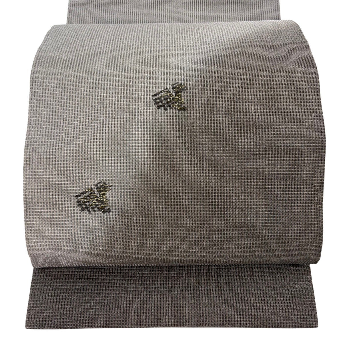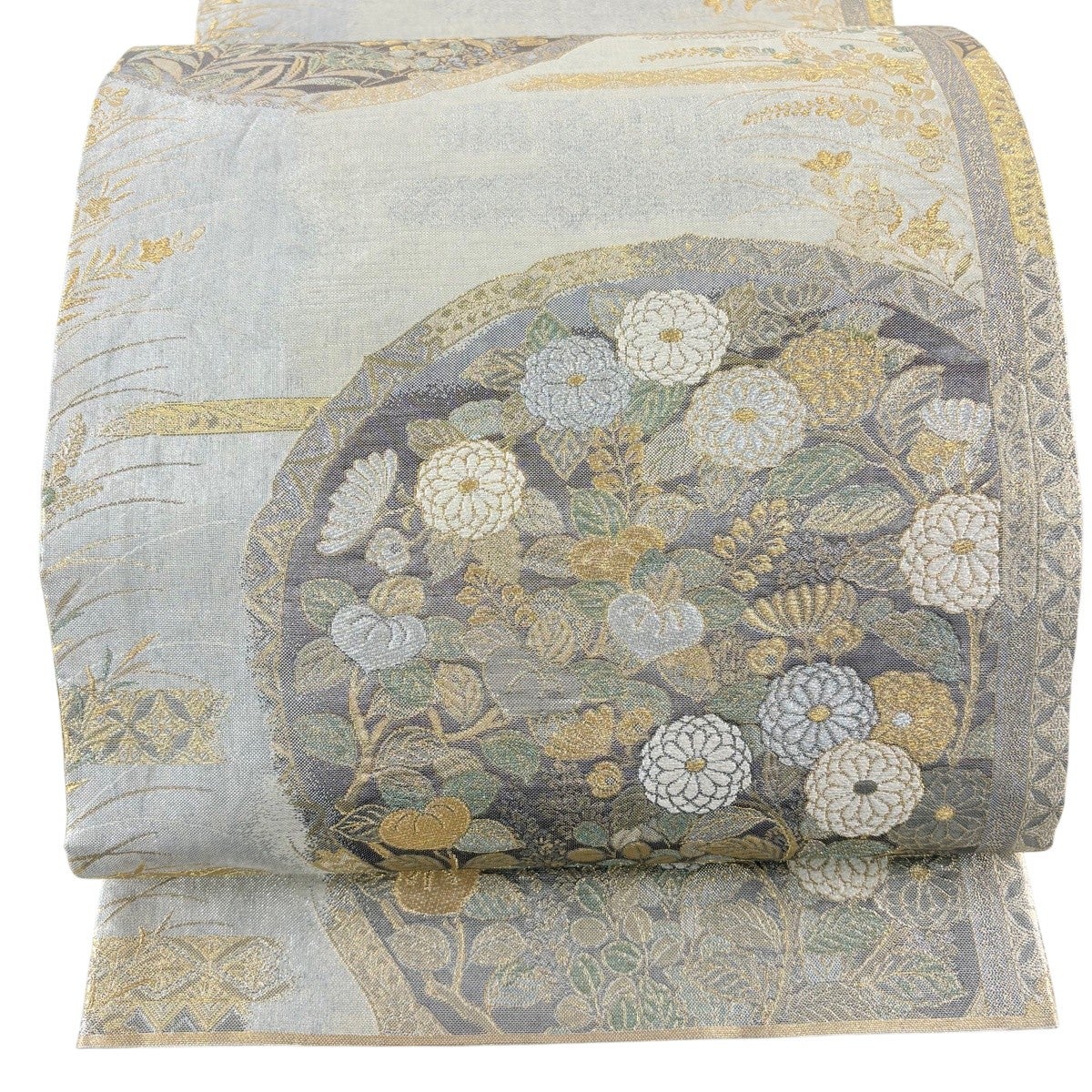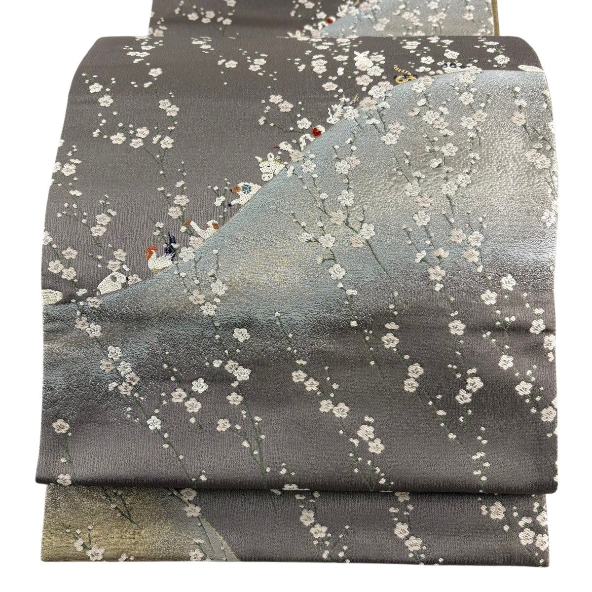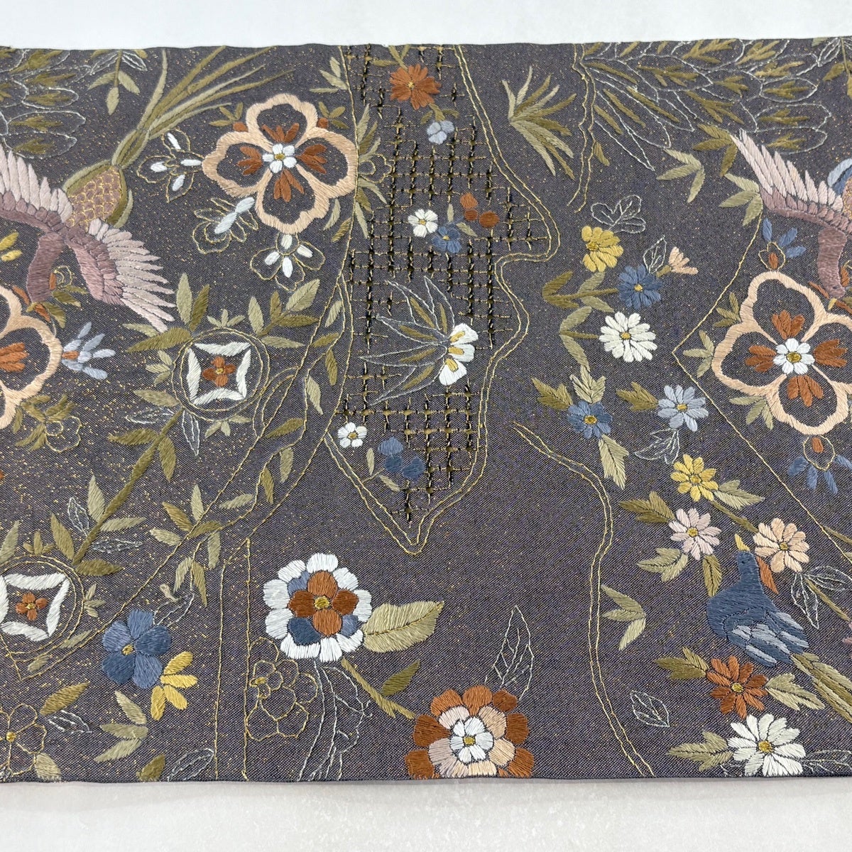 袋帯 逸品 花鳥 華文 金銀糸 刺繍 灰茶 六通 正絹