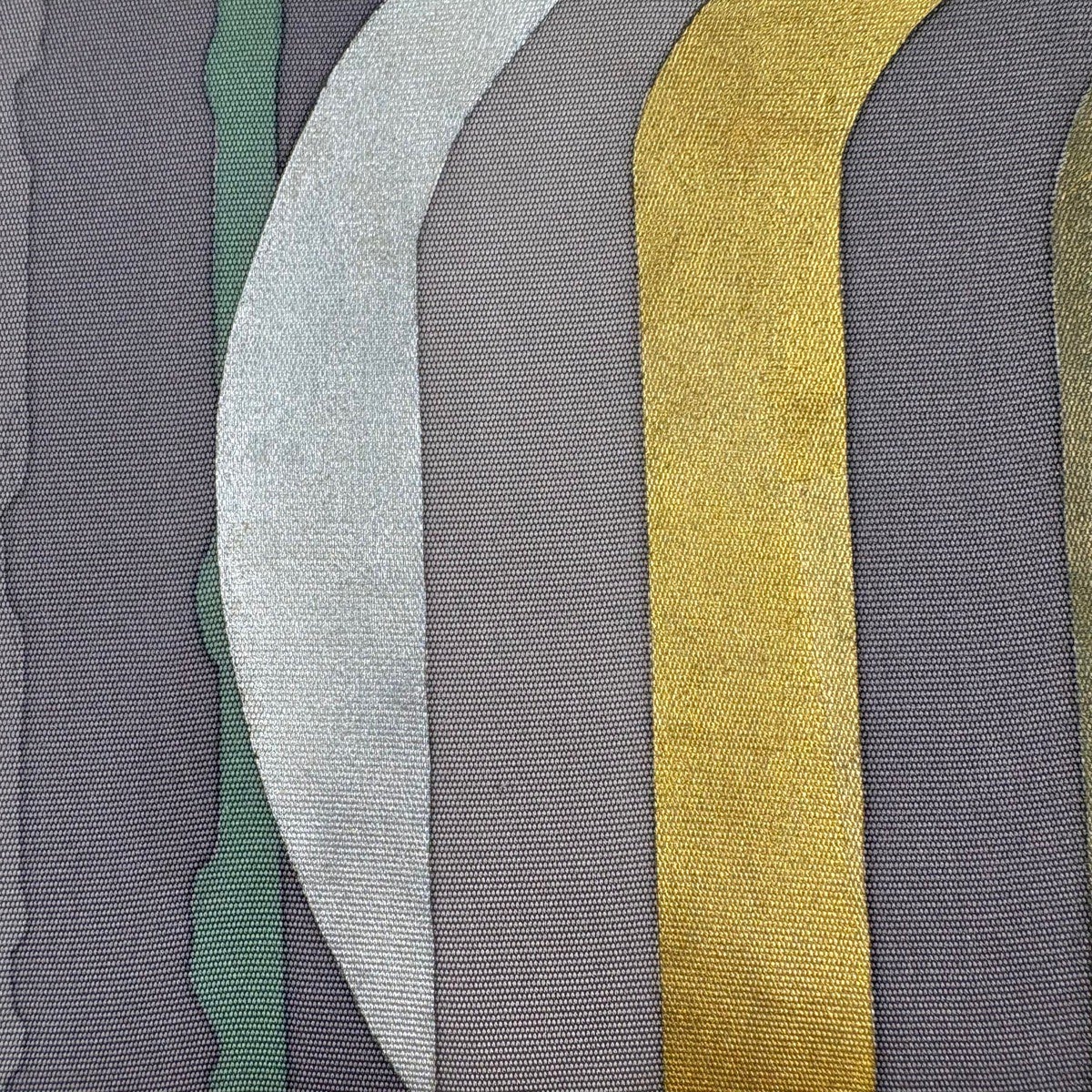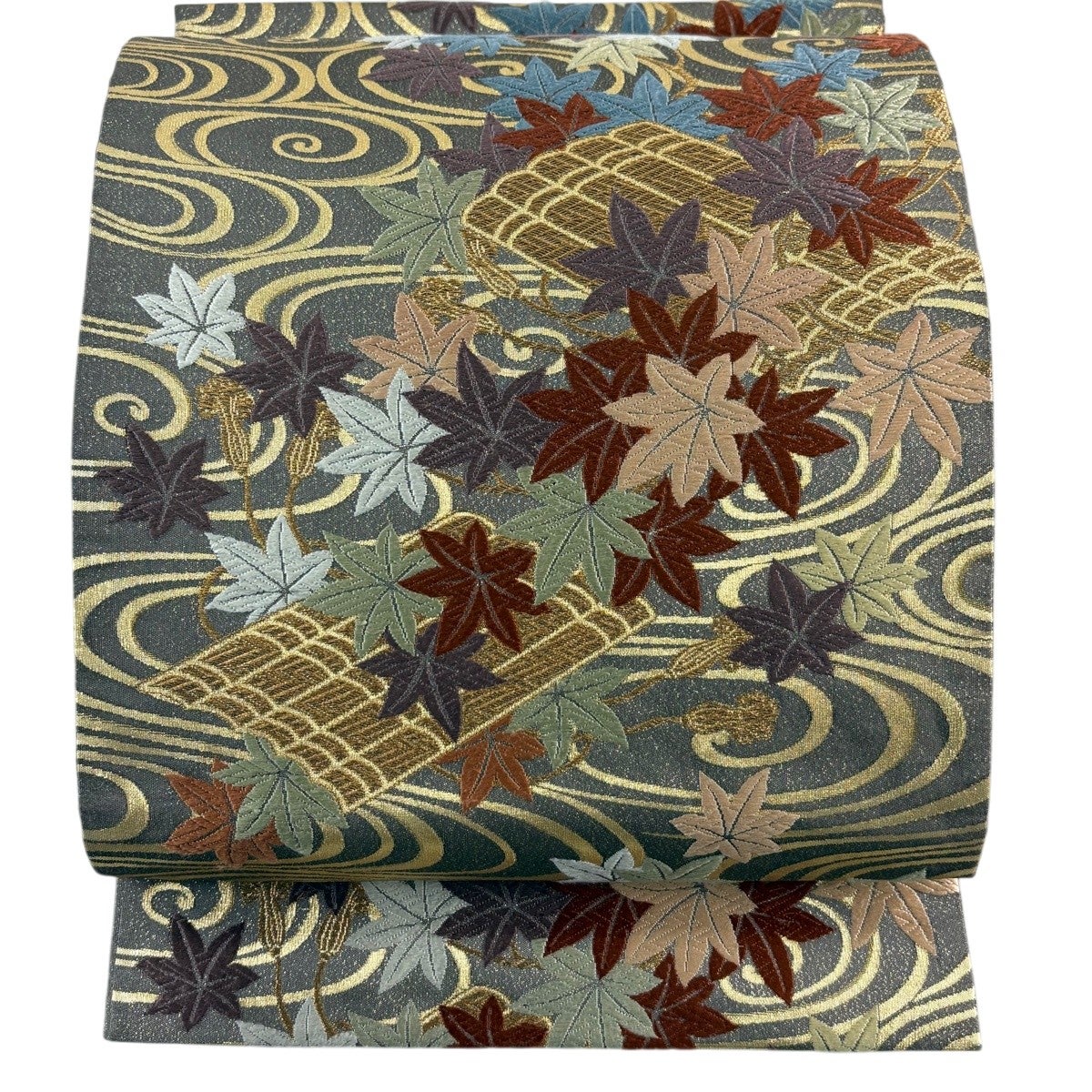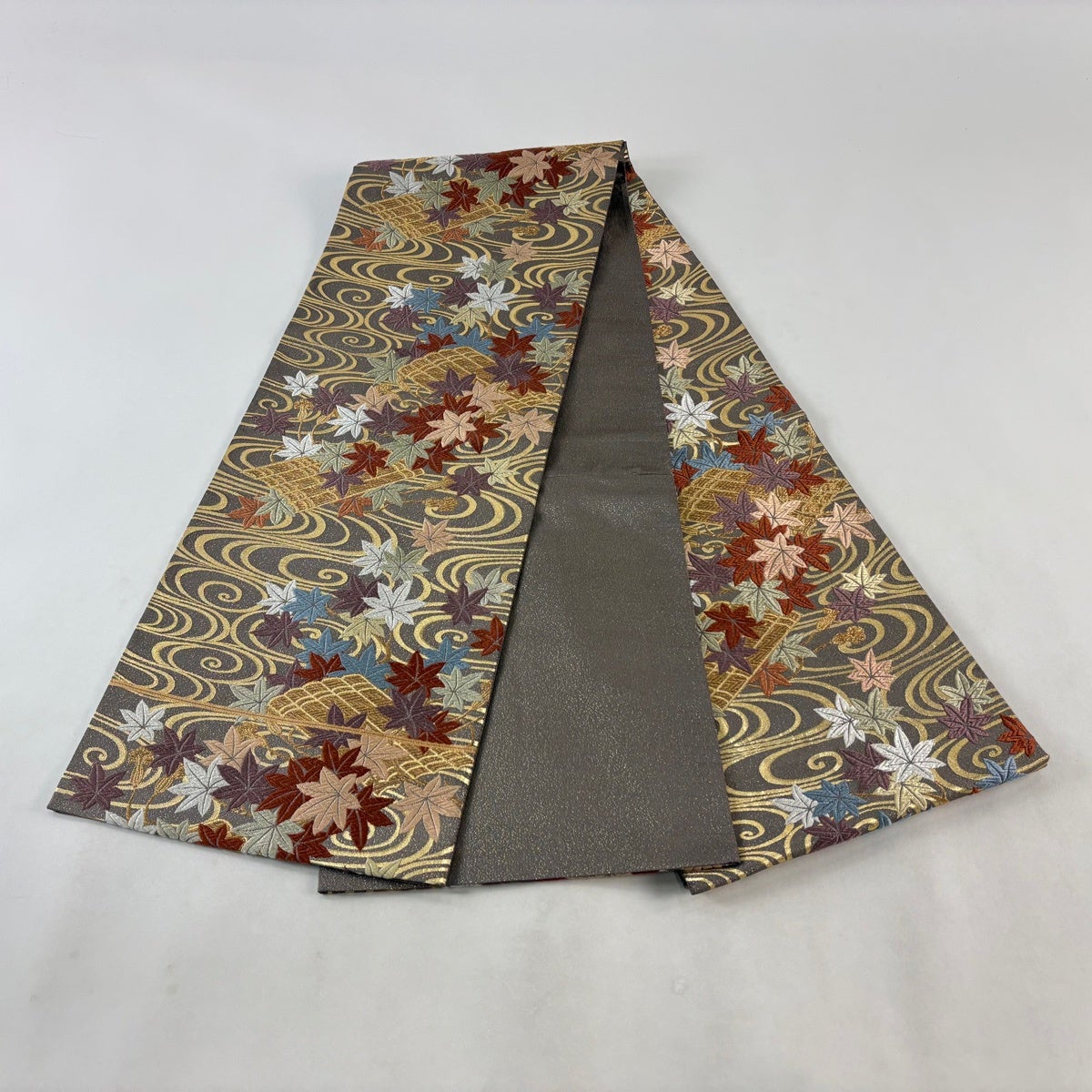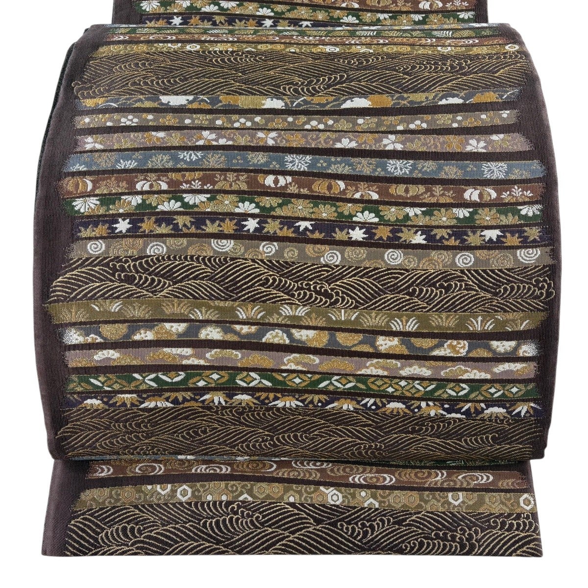 【美品】 袋帯 秀品 草花 波頭 金糸 箔 灰茶 六通 正絹