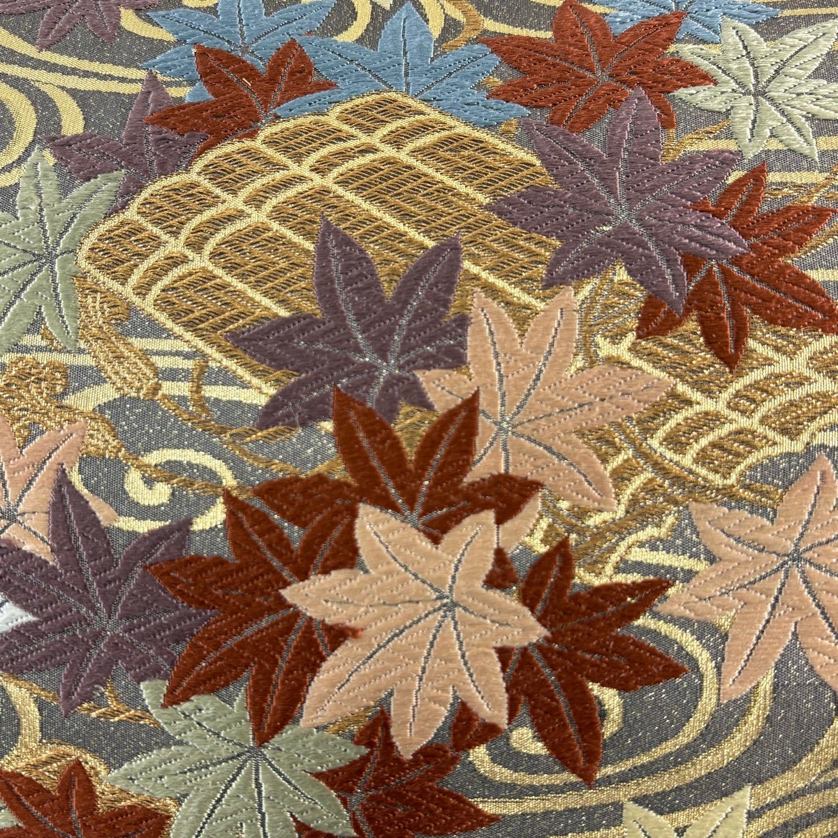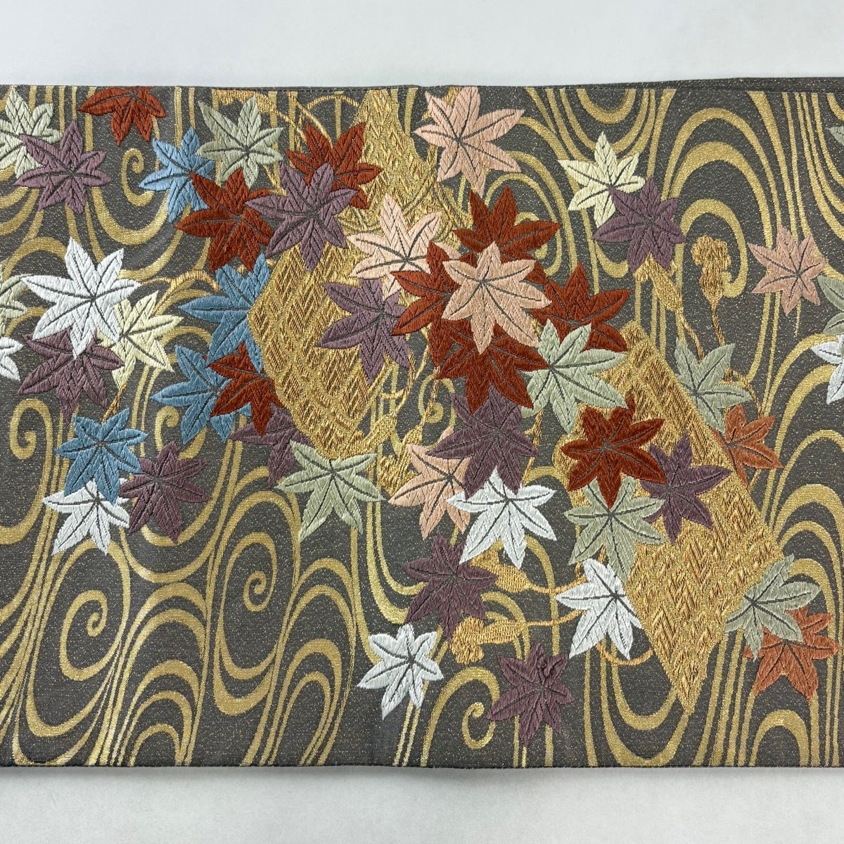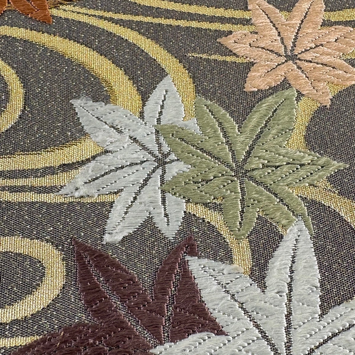 【美品】 袋帯 名品 葉柄 螺鈿 金彩 灰茶 お太鼓柄 正絹