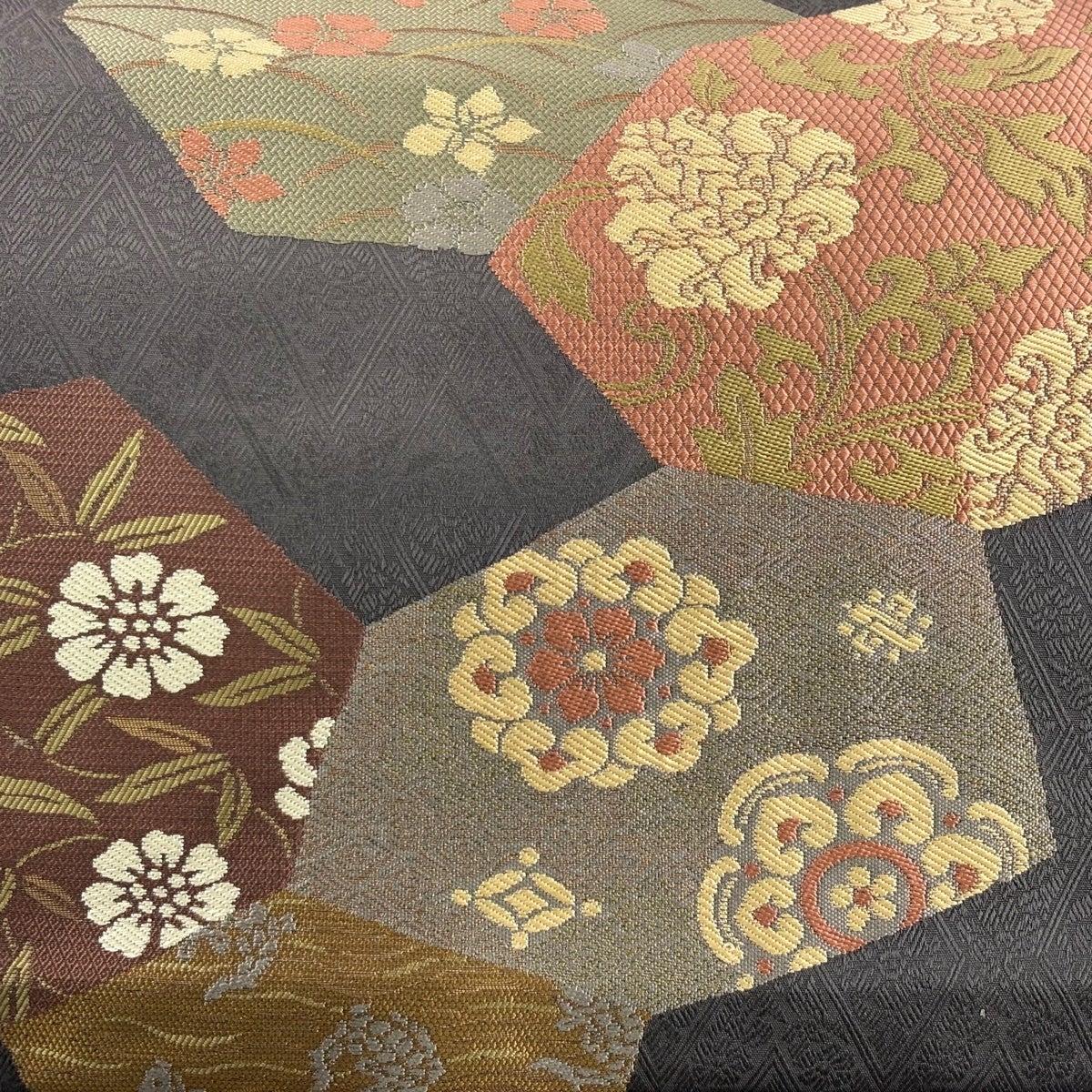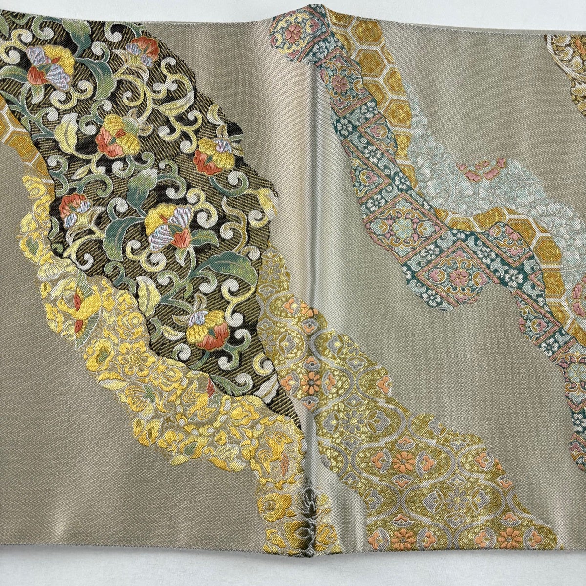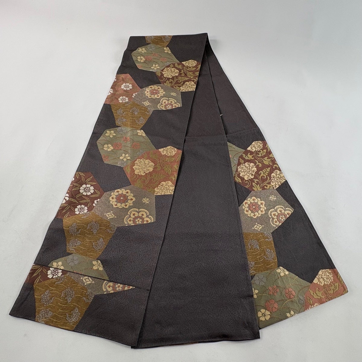 【美品】 袋帯 秀品 草花 亀甲 金糸 灰茶 六通 正絹