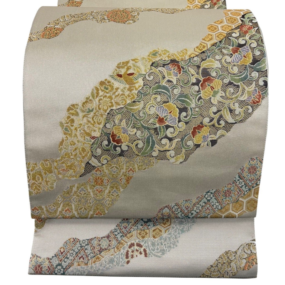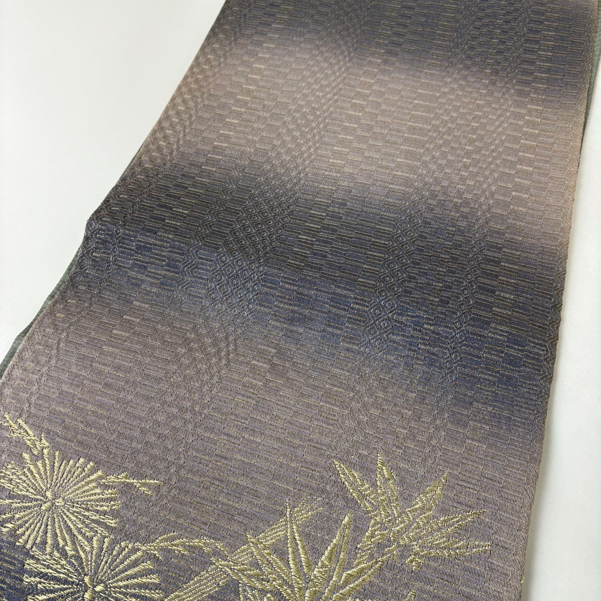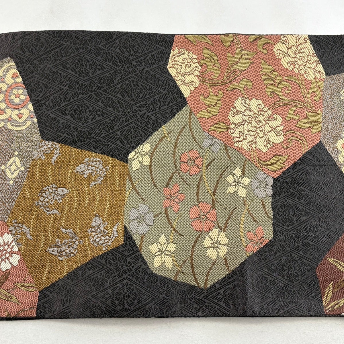 【美品】 袋帯 秀品 草花 亀甲 金糸 灰茶 六通 正絹