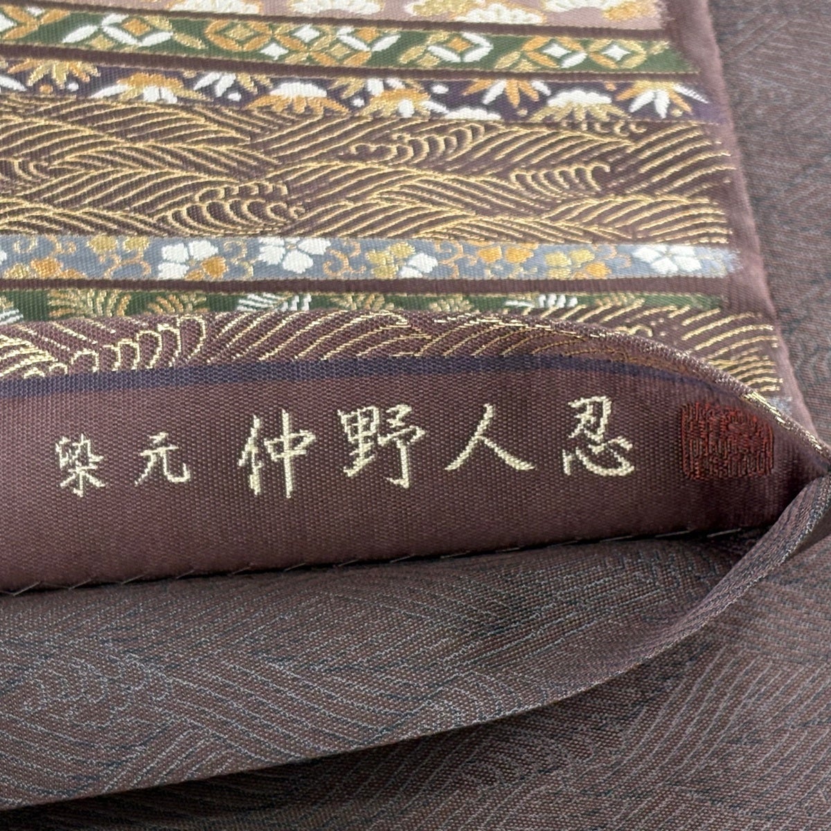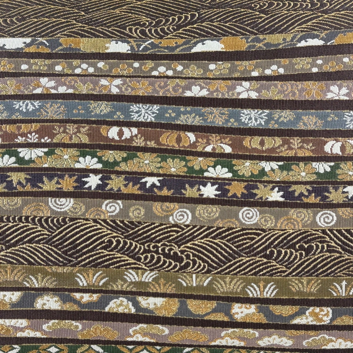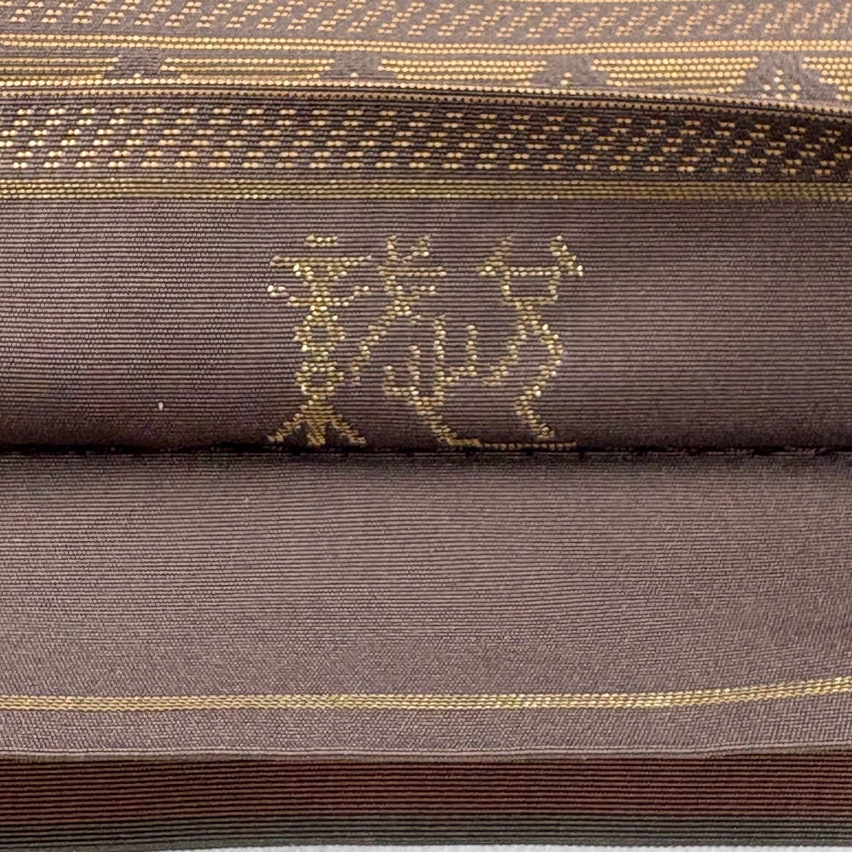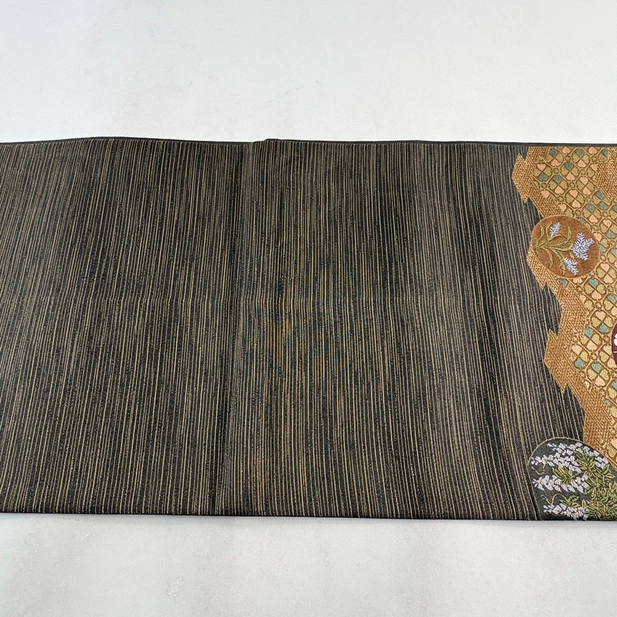 袋帯 秀品 落款あり 華文 縞 箔 灰茶 お太鼓柄 正絹
