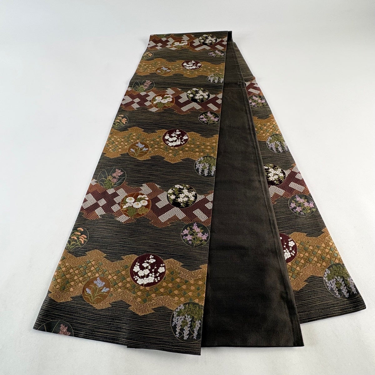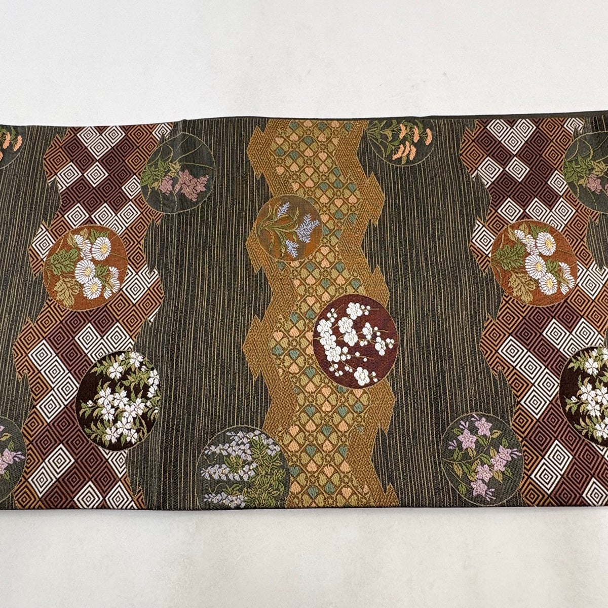 袋帯 秀品 織悦 落款あり 鱗 花 箔 灰茶 全通 正絹