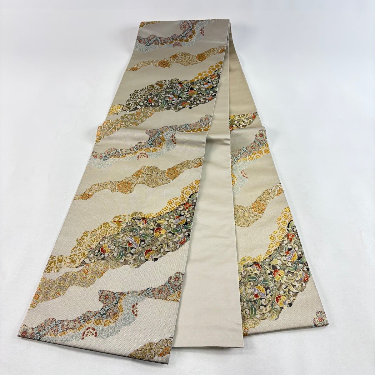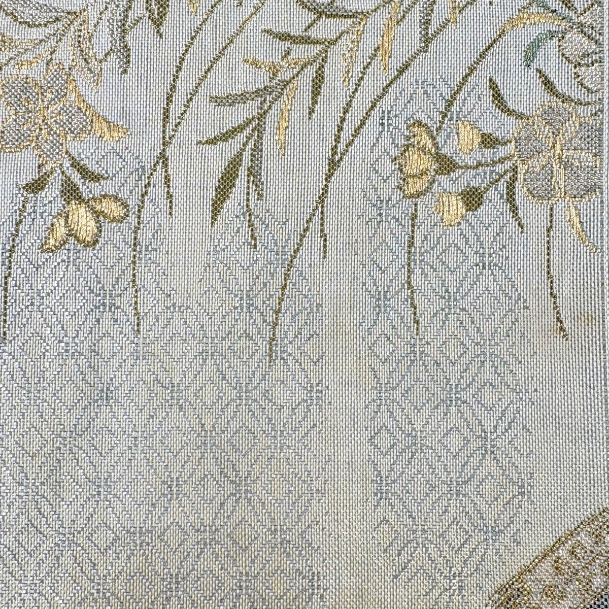 【美品】 袋帯 秀品 草花 波 金糸 灰茶 全通 正絹