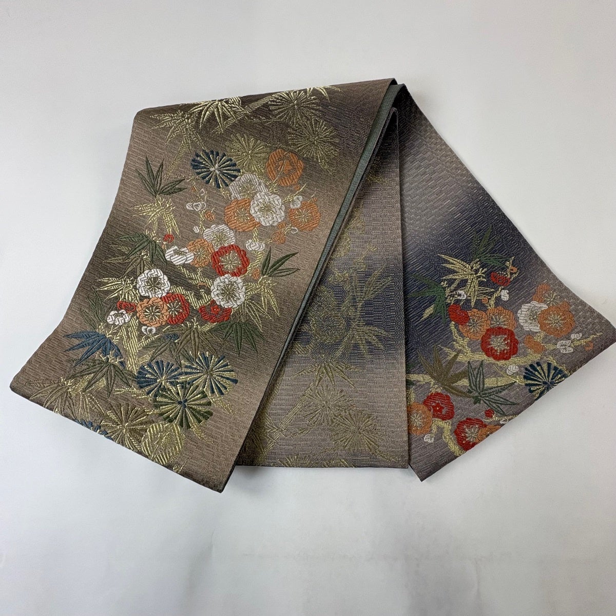 【美品】 袋帯 秀品 松竹梅 金糸 灰茶 お太鼓柄 正絹